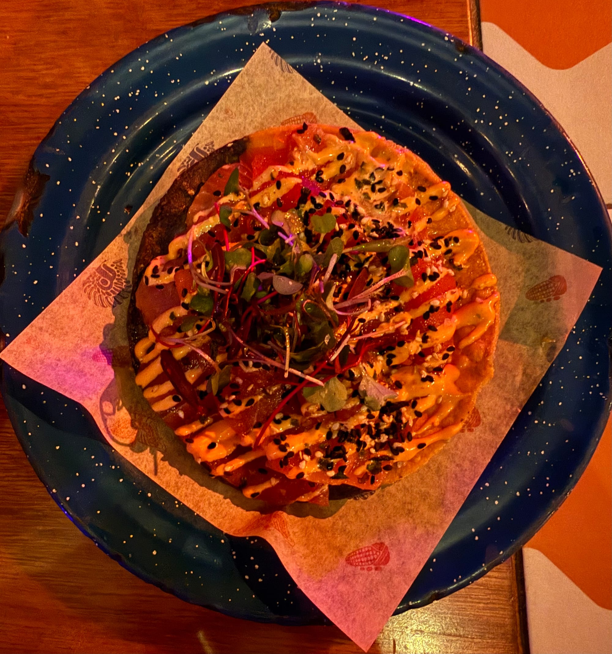 Switching from soft to hard tortillas, next up was the Tuna Tostada. I'm on the record as loving these, from Mexico City to Houston, and even created at home with the help of Costco's surprisingly excellent spicy ahi tuna poke that you can easily turn into a meal with some tostadas, avocados, and pickled red onions. Nixta's interpretation included yellowfin tuna cured in citrus & tamari, avocado, chipotle aioli, microgreens, and furikake. They really went all out on this one: the fish was full of umami and bright lime flavor, plus the smoky, savory, and fatty accoutrements made for a delectable bite.