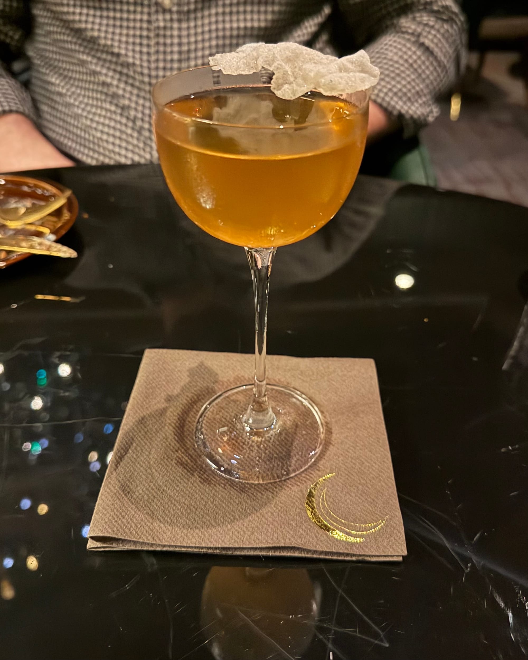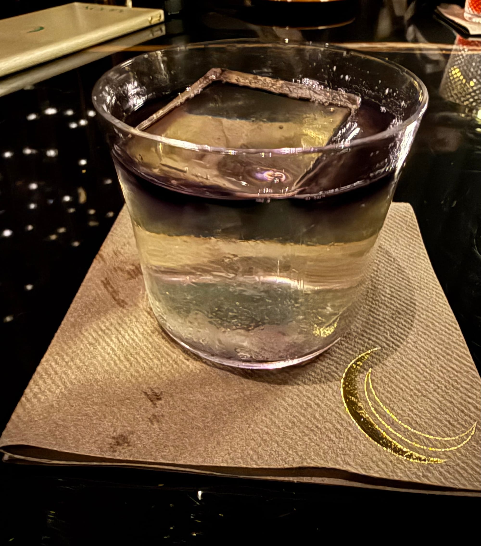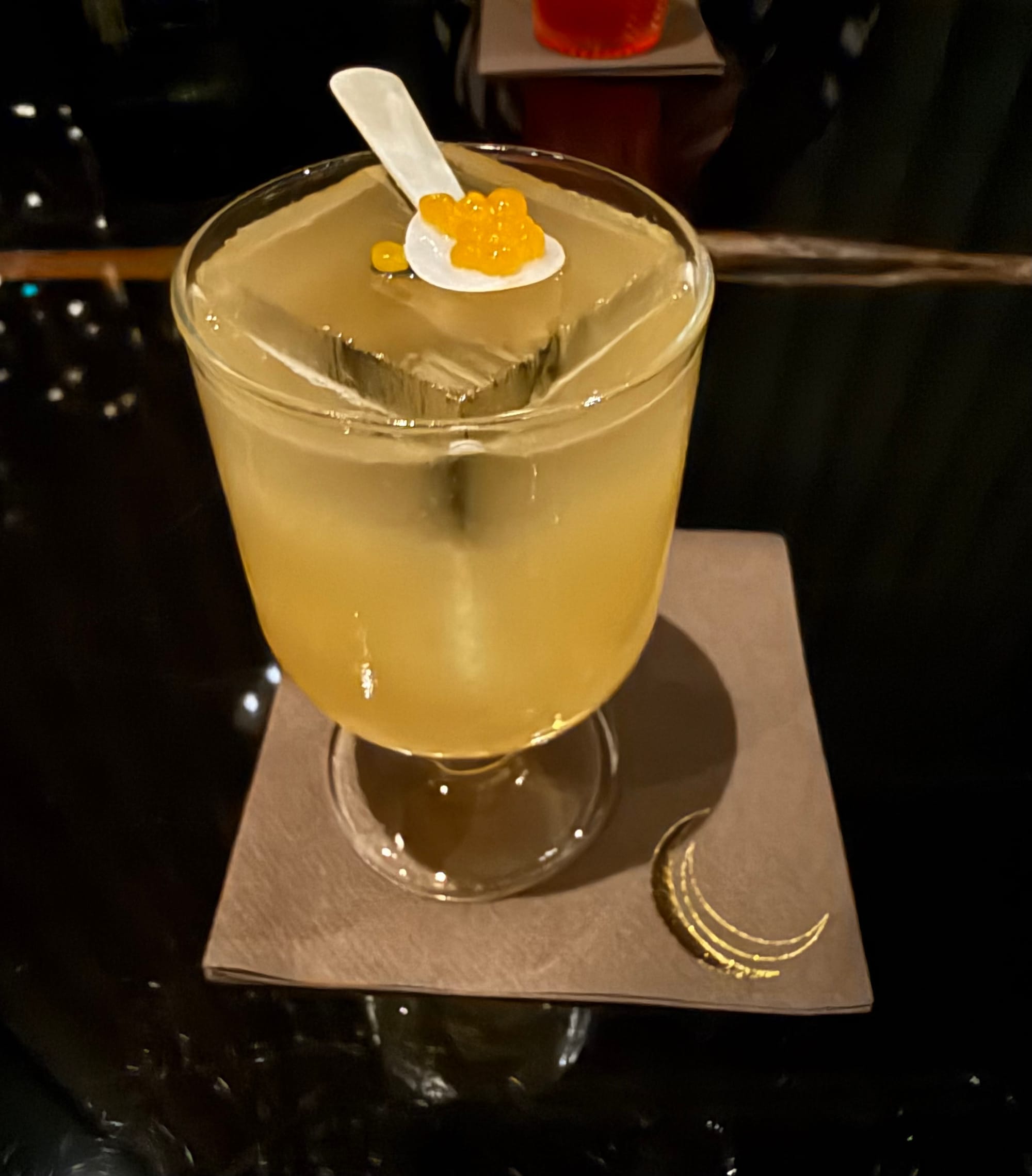 To start, the Morning Dew, which I think is symbolized by a waning gibbous, if I can recall my elementary school education on the phases of the moon. This bright concoction had Montelobos mezcal, yerba maté (!!), sparkling wine, and was topped with passion fruit "caviar". Effervescent, with smoky and bitter notes that contrasted with the intensely sweet and sour little yellow orbs that sat atop the large ice cube, this was a remarkable cocktail that made me do the eyes emoji and almost instantly changed my attitude about this bar.