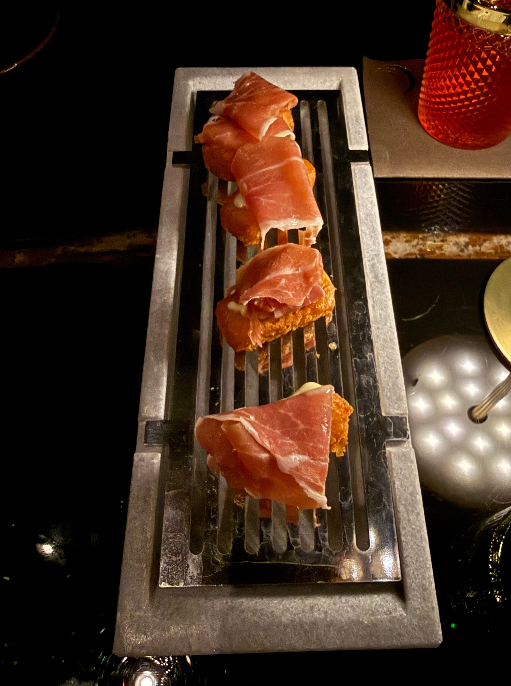 Atop the elevator, the hostess greats you with a welcome "jello shot": a gold-dusted jiggly cube of gin and sparkling wine, taken rather pompously in the manner of a caviar bump (their words), but, whatever, it was pretty good. The signature cocktails are all "guided by the lunar cycle", whatever that means... again, quite pretentious, but I'll forgive it, because the quality was spot-on.