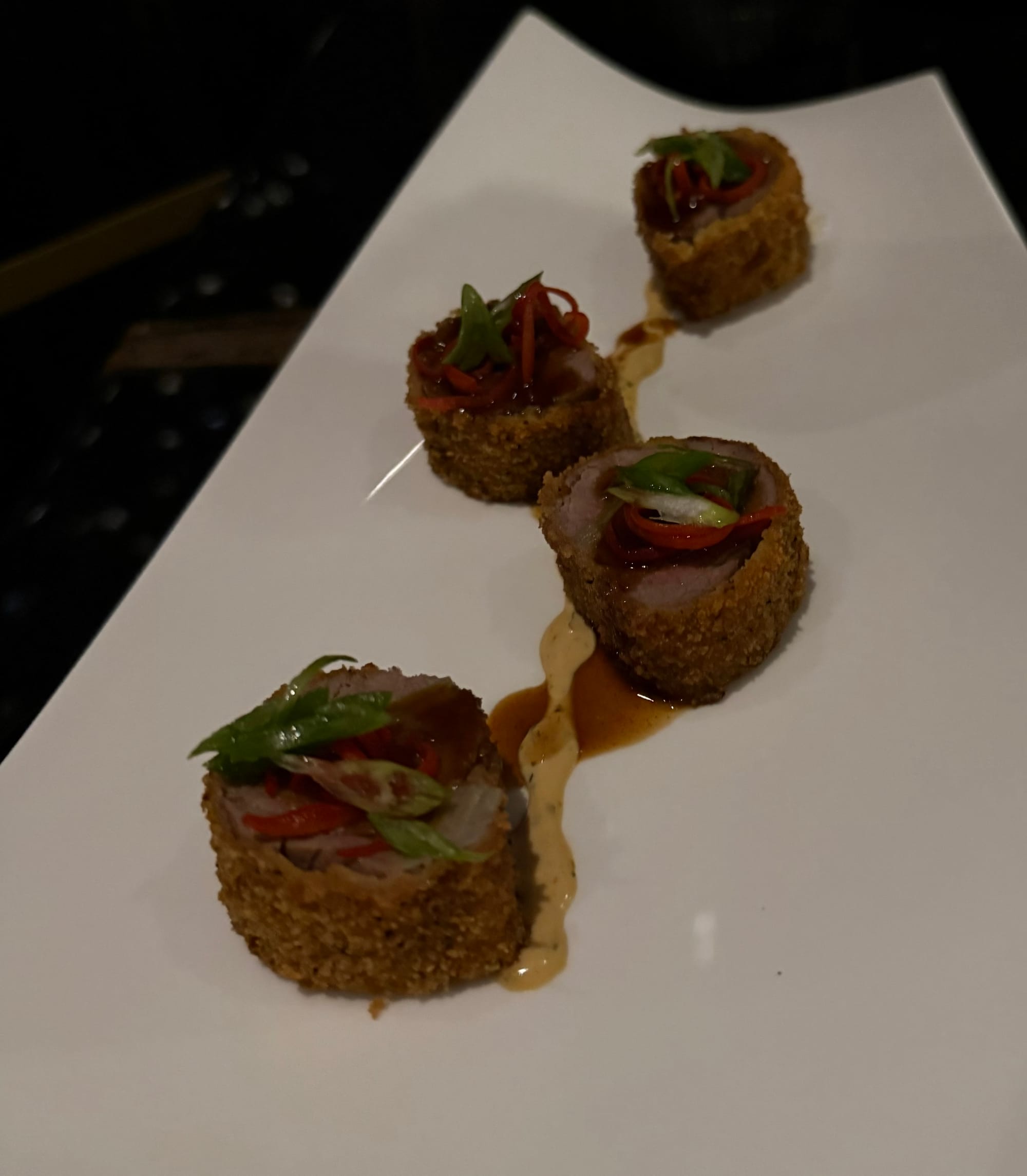 Speaking of wagyu, the Beef Katsu Rolls were big hit among our party of two. The name of this Japanese deep-fried staple comes from katsuretsu, meaning cutlet, but instead of the traditional chicken or pork, the steak here really leveled things up. Delicious, fatty beef was coated in bread crumbs and cooked to a tremendous crisp, topped with scallions and Fresno peppers, and drizzled with tonkotsu and sesame sauces. These tangy and nutty twin condiments contrasted well with the luxurious, rich Wagyu bites.