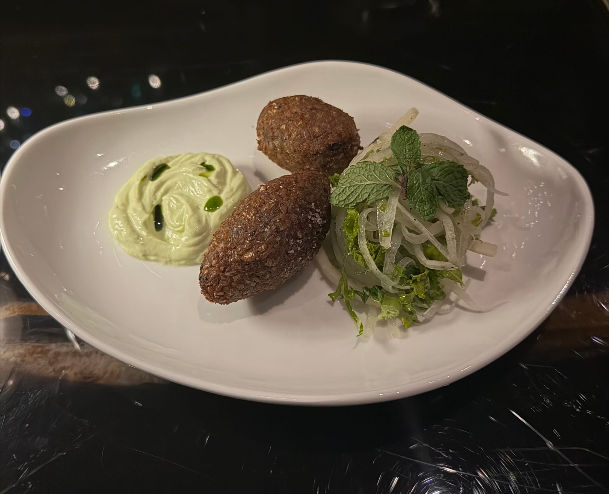 Still not totally satiated after this parade of small plates, we opted for one more savory selection, and I'm sure glad we did, because the best was saved for last. Kibbeh are Middle Eastern croquettes, made from pounding bulgur wheat and meat into a paste, which is then formed into ovoid shapes, stuffed with more meat, and (in this case) fried. Exquisite, earthy spices shone through, and the accompanying daikon salad and mint yogurt were a welcome cool and fresh pairing. These were stellar (astronomy pun), and I intend to try more variations of this Levantine delicacy as soon as possible.