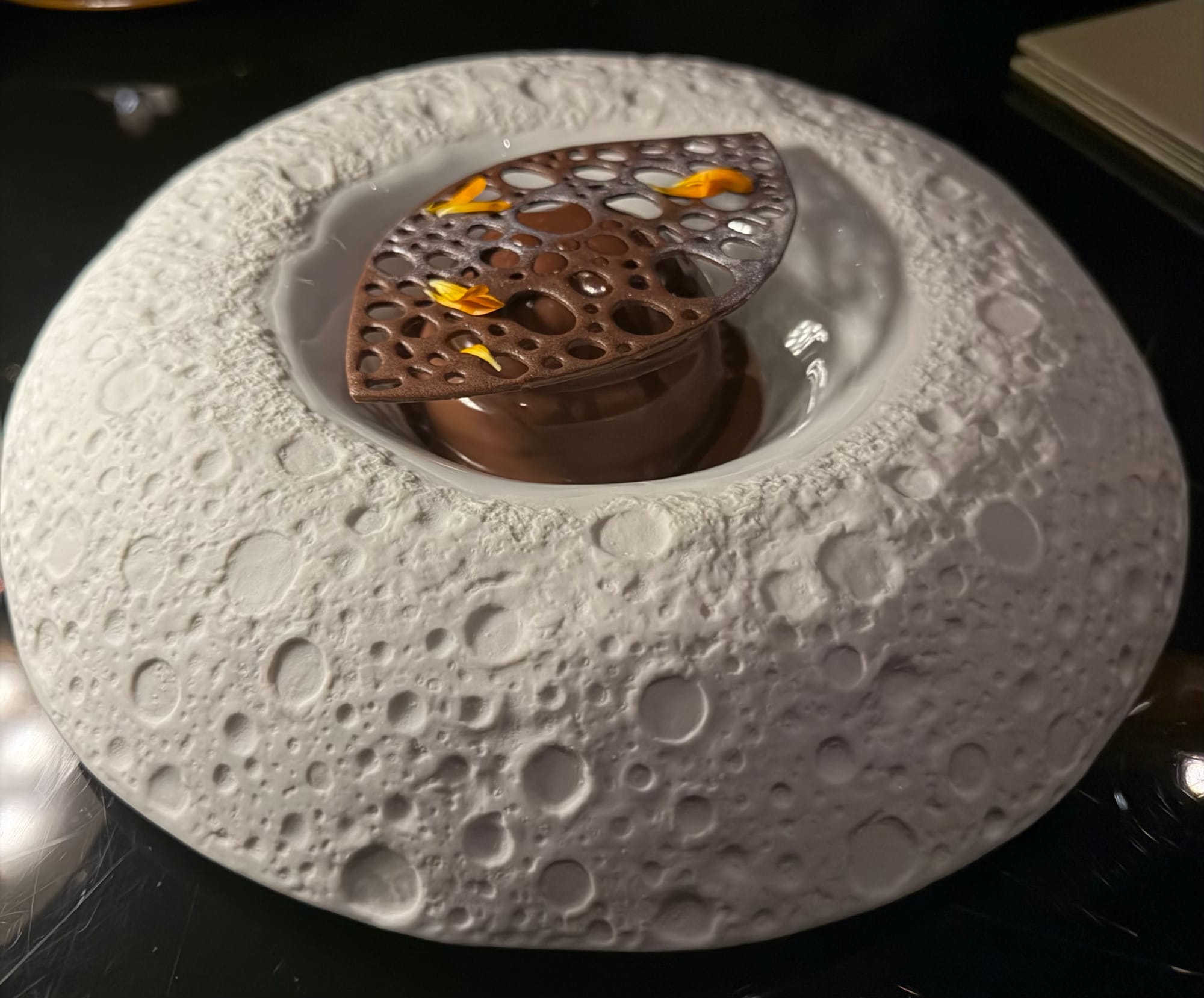 Dessert is usually something of an afterthought at these types of places, so I was quite surprised at the brilliance of the Dark Side Of The Moon. This decadent chocolate moelleux (essentially a French lava cake) was drenched in a porto chocolate sauce, topped with hazelnut crunch and a gorgeous chocolate tuile, and served with vanilla ice cream in a distinctly lunar, crater-filled bowl. Very rich, but absolutely fantastic... perhaps the single best item, solid or liquid, of the entire night, and also the best tableware (non-penis-shaped division).
