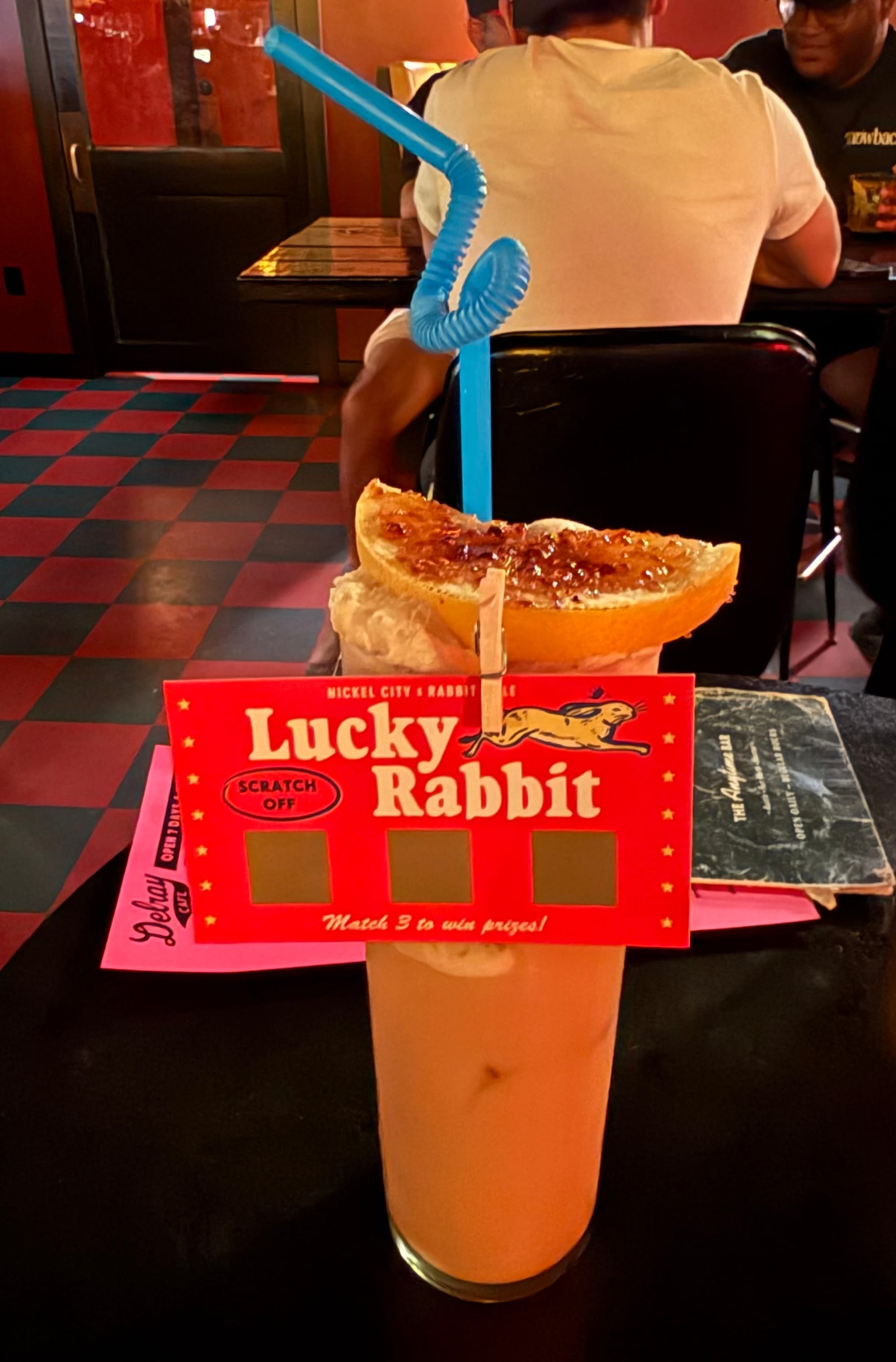If you know me at all, you'll recognize that I jumped right to the Unknown portion of the menu. The amount of ingredients in some of these drinks might make one's head spin. My "Lucky Rabbit" included sarsaparilla-infused Rabbit Hole bourbon, Giffard Banane du Brésil (a French liqueur made with Brazilian bananas), amaro, oleo saccharum (aka lemon syrup), vanilla, cardamom, cream, and "bubbly water", which seems to be included in a lot of items here but I guess is just club soda. I'm not sure what kind of mad scientist-mixologist came up with this concoction, but I'll be damned if it wasn't delicious: plenty of sweetness but a nice bite from the bourbon and some citrus and bitterness from the amaro, plus a bit of tingly carbonation. Essentially this tasted like a boozy banana root beer float... I challenge you to come up with something that sounds more mouthwatering than that. Plus it was topped with a caramelized orange slice for some bonus flavor if you chose to chew on it. This also came with a fun twisty straw and, more importantly, a custom scratch-off lottery ticket that could win prizes if you matched three of the same symbol! Devastatingly, I did not win, and my gambling impulse nearly forced me to order another of the same to try to win that sweet sweet prize (whatever it was), except for the fact that my demanding audience expects me to try more than one beverage, and also that I would never ever order the same thing twice, blog or not.