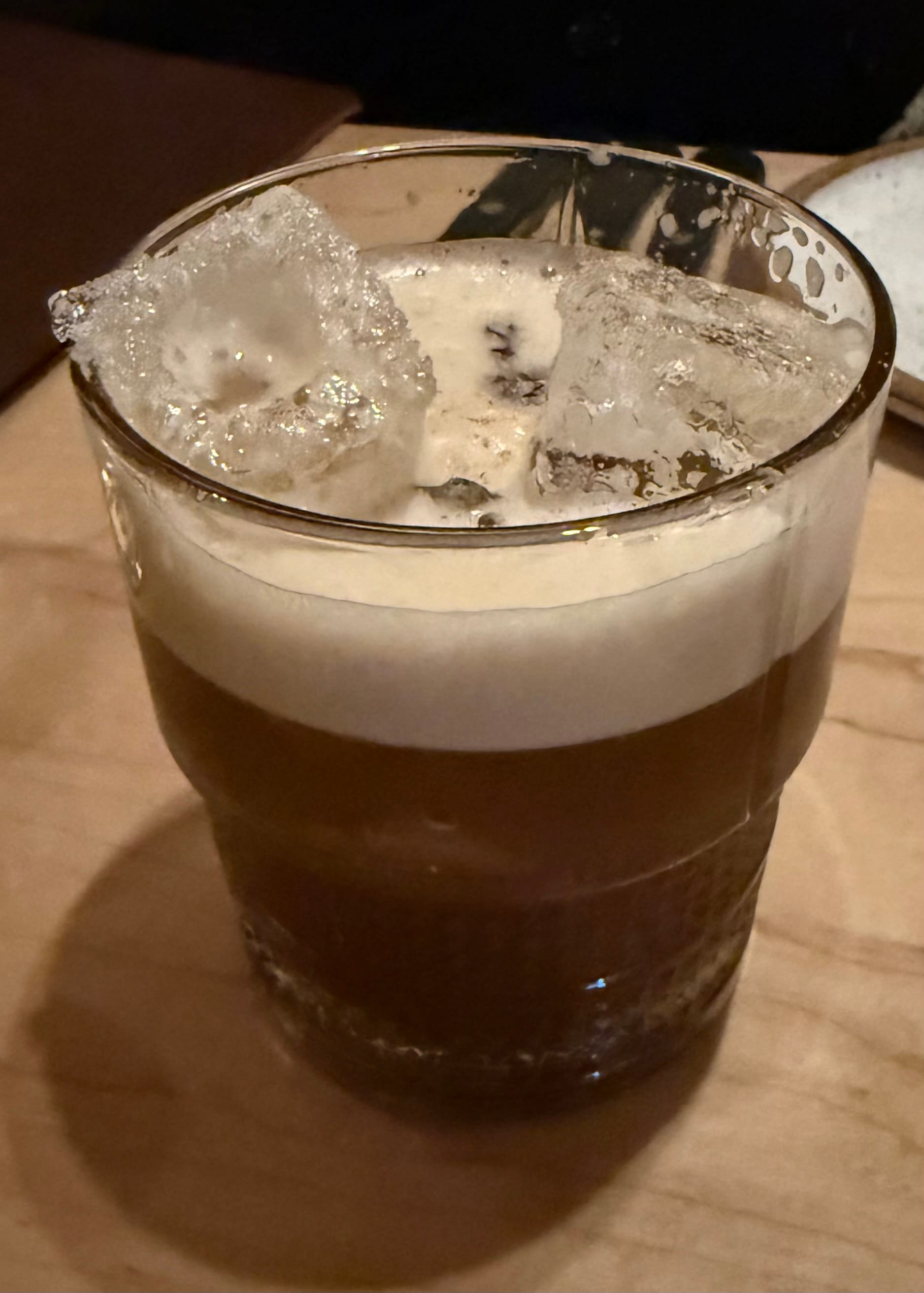 Unquestionably the (unexpected) highlight of the night was the spectacular Carajillo. This cocktail, probably familiar to many of my Houston and Mexico City friends, was done with Union Joven mezcal, the essential Licor 43, espresso, candied orange, piloncillo (unrefined cane sugar, a word I coincidentally only learned the week before), and Fernet-Vallet (a Mexican herbal amaro). I generally prefer carajillos to espresso martinis, as the latter are often too coffee-forward for my taste, and because I adore the beguiling Cuarenta y Tres liqueur. This one had the absolute perfect amount of coffee flavor, accentuating but not overpowering, and the smokiness from the mezcal brought an element not usually seen in this drink that has been growing in popularity recently (I've even seen carajillo billboards on I-10 the past few months). I'm not sure I'm doing justice to how amazing this was... honestly it redefined what coffee-based libations could be for me. As much of a must-order as there has ever been.