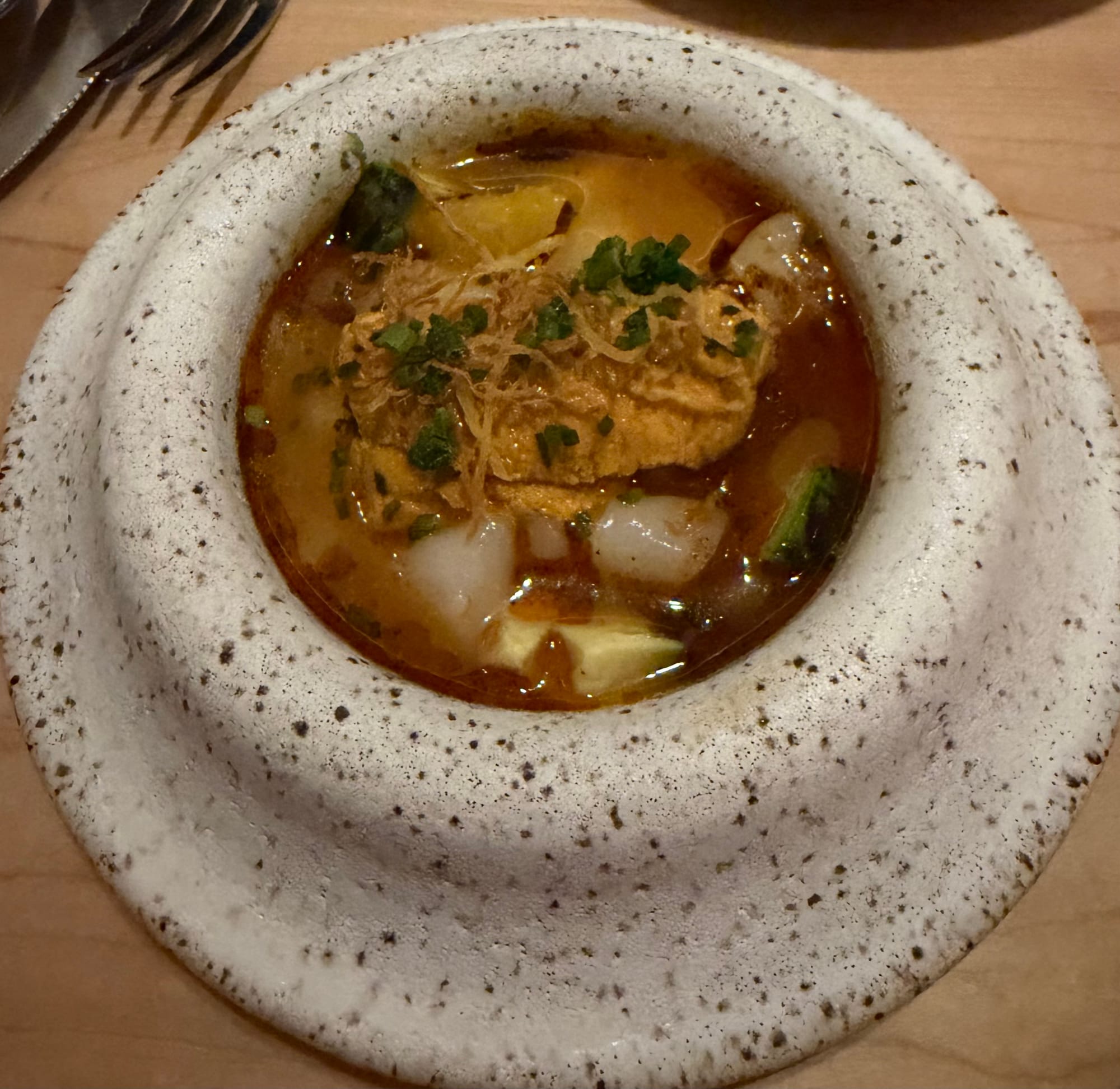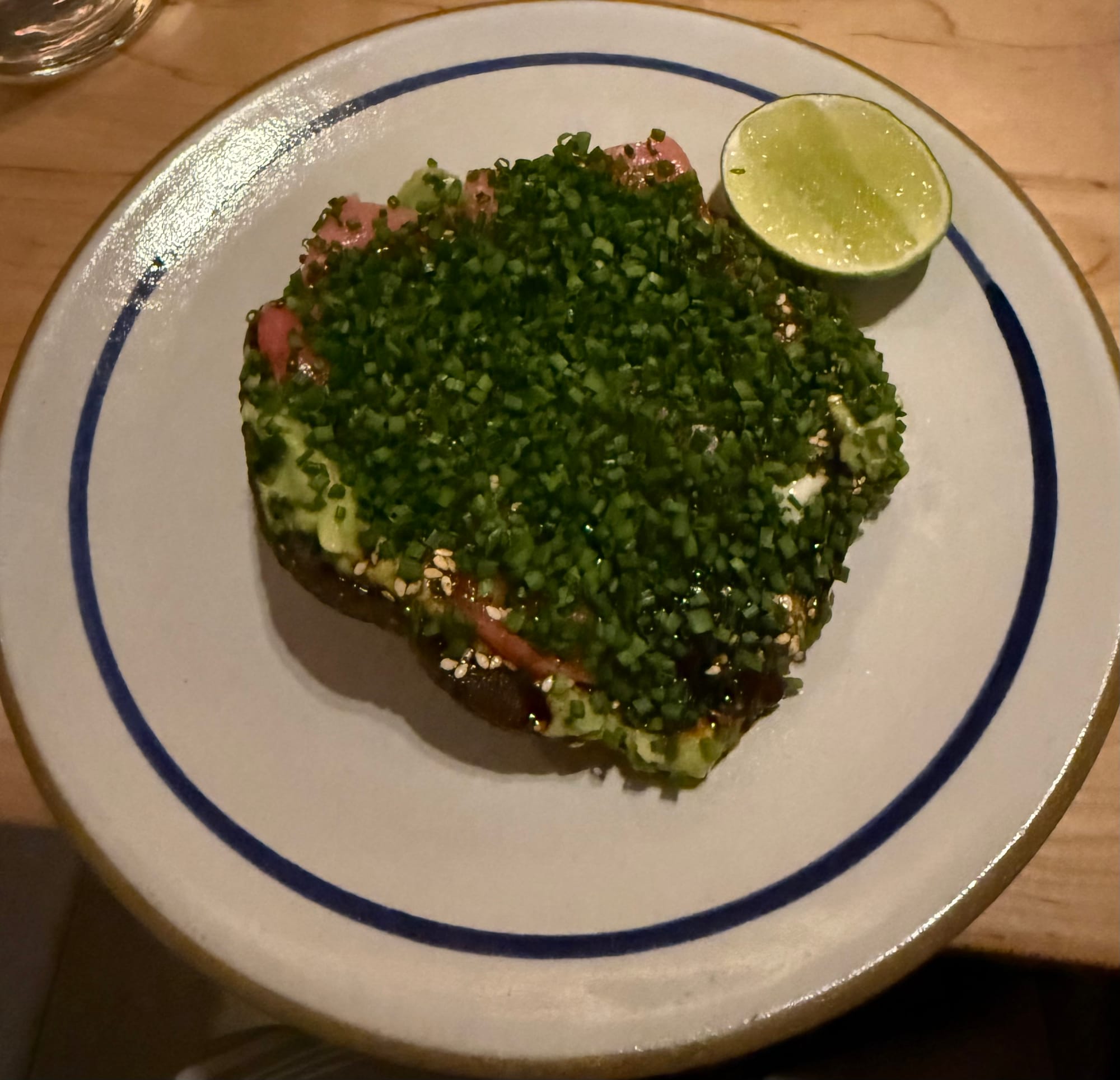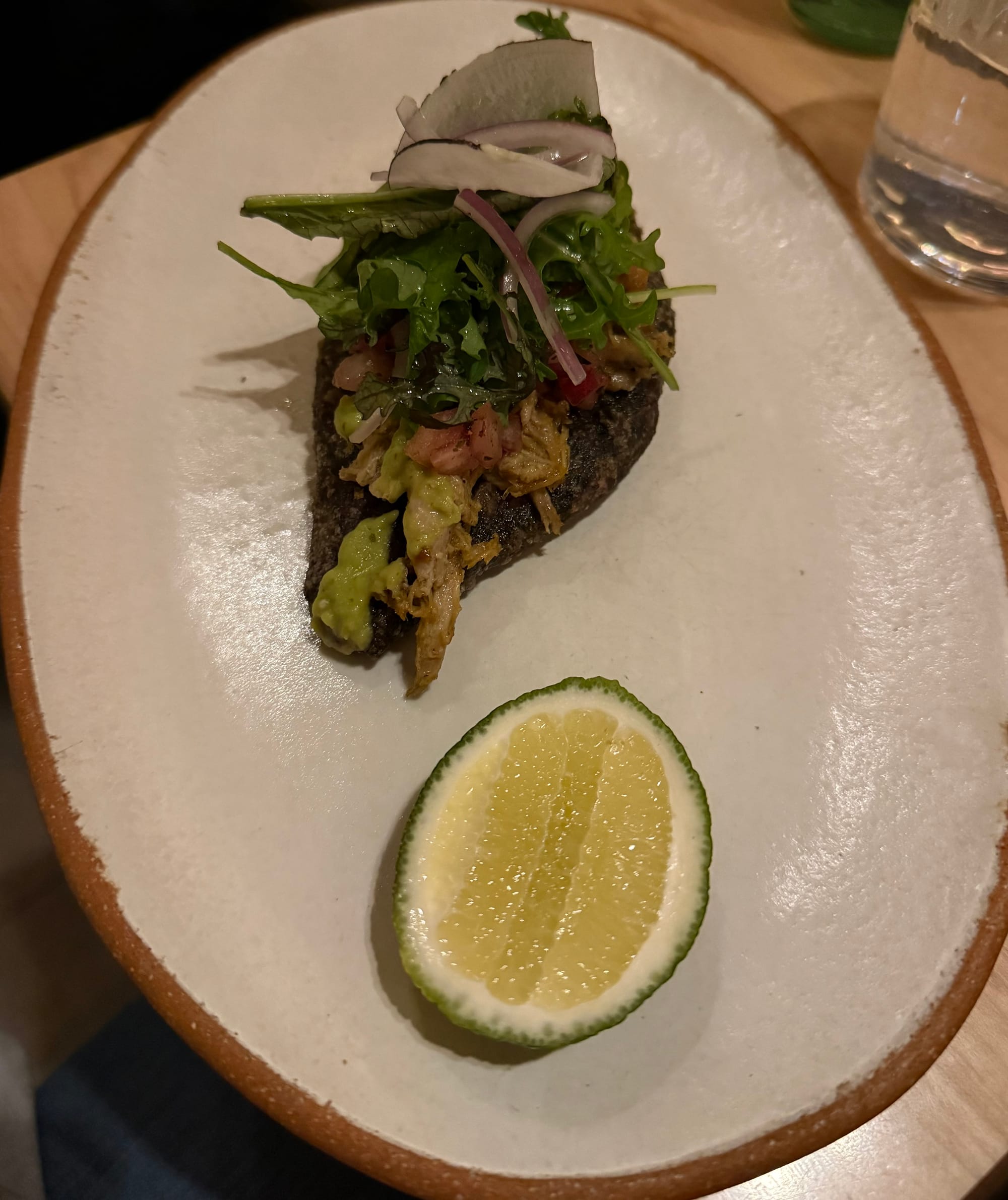 Hardcore Adrian Reviews readers will know by now that I love tuna tostadas, so I had to order the Tostada de Toro here. It was described by the waiter as "what dreams are made of", and he was not kidding: this was hands-down the best one I've ever had. The dry-aged fatty tuna belly sat atop smashed avocado and a charred habanero mayonnaise, was drizzled with a sesame chile oil, and covered by a dense forest of chives. Rich and decadent, this was unctuous, spicy, and, with a squirt of lime juice to provide some acid, came together as one of the best things I consumed in 2025. I would go back solely to eat another one of these (not that everything else wasn't excellent!).