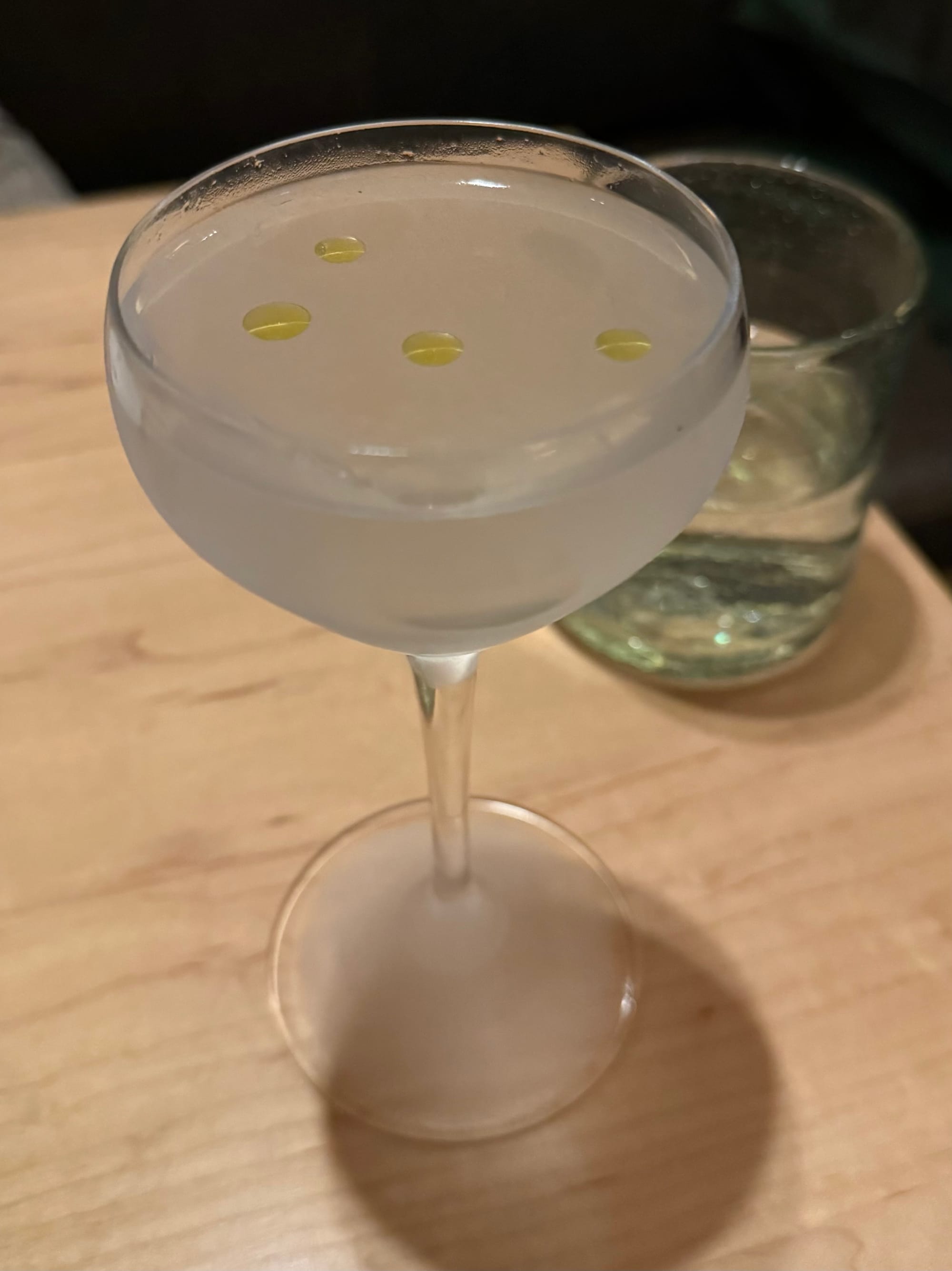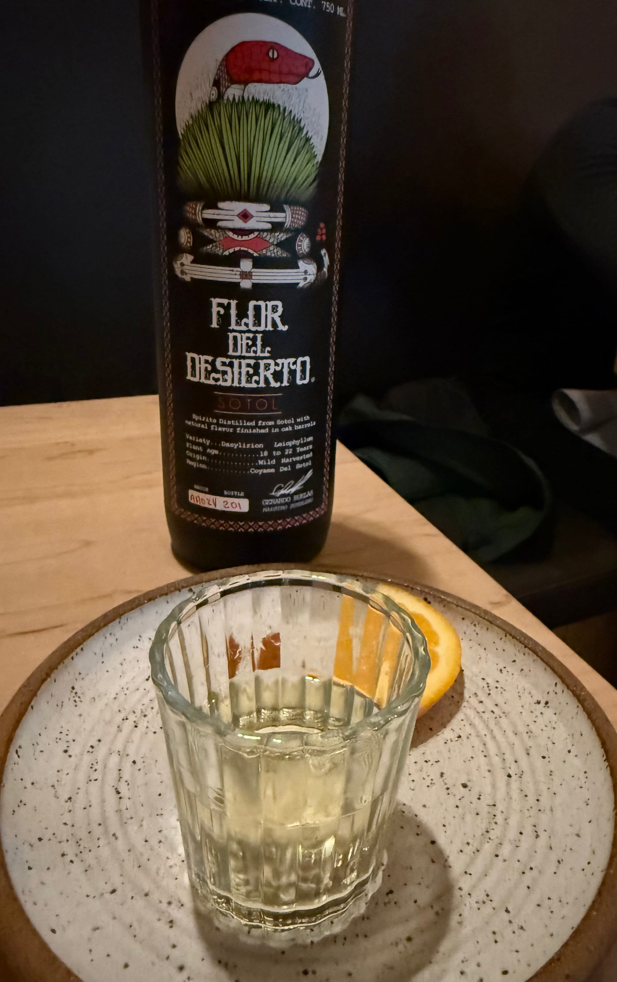 In addition to crafted beverages, there is an extensive list of agave-based distillates: mostly mezcal, some tequila, and about twenty other Mexican spirits. I was feeling a bit frisky at this point, so I asked the waiter for the weirdest one they had... and he brought me Flor del Desierto Rattlesnake sotol (a liquor similar in taste to tequila and mezcal, made not from agave but from the desert spoon plant). That's right, this sotol's distillation process involves throwing a literal snake into the mix, imparting some bite and funk (my notes here just say "rattlesnake sotol let's goooooo"). A very unique finish to the evening, and another notch on my belt when it comes to trying weird stuff.