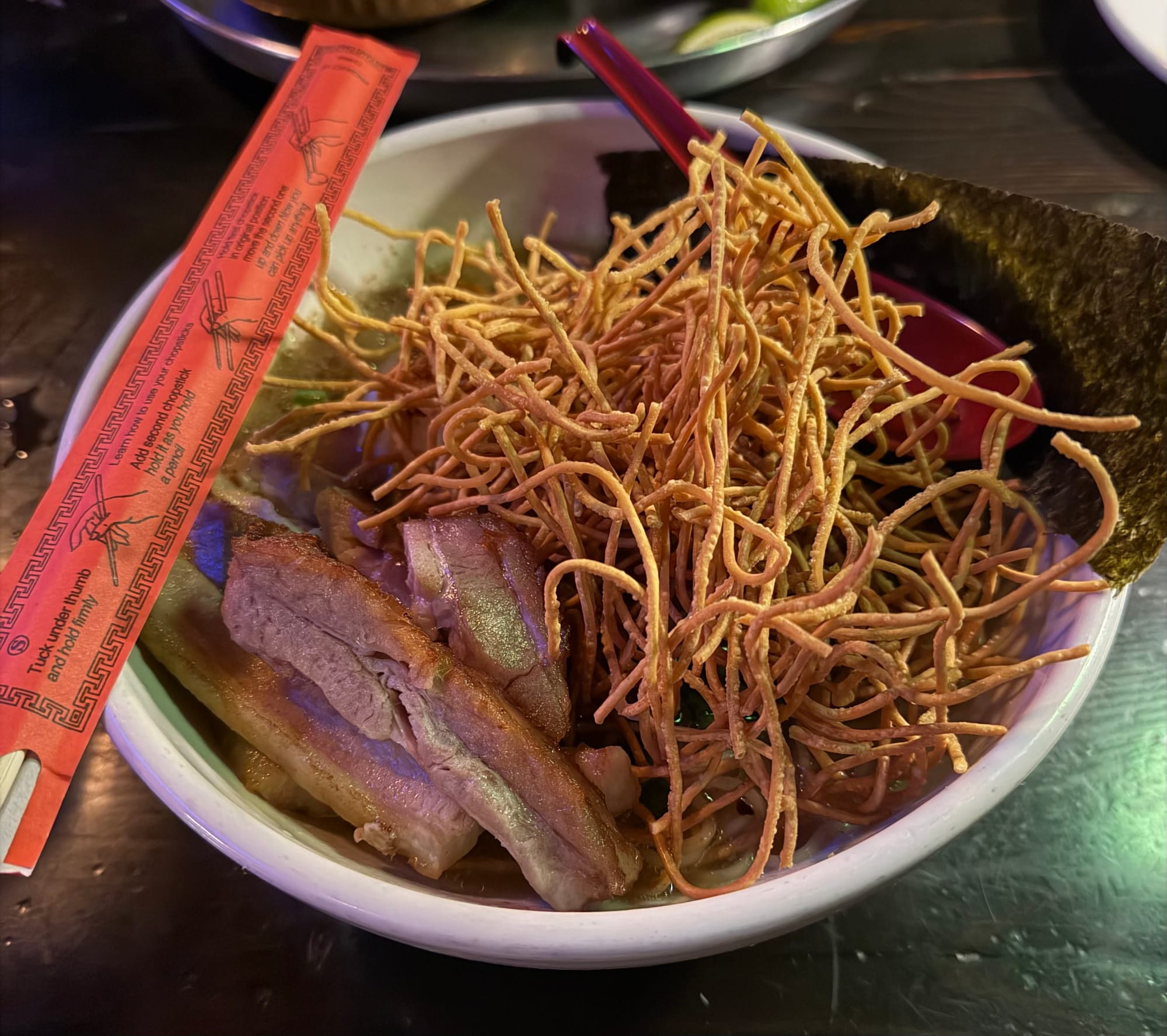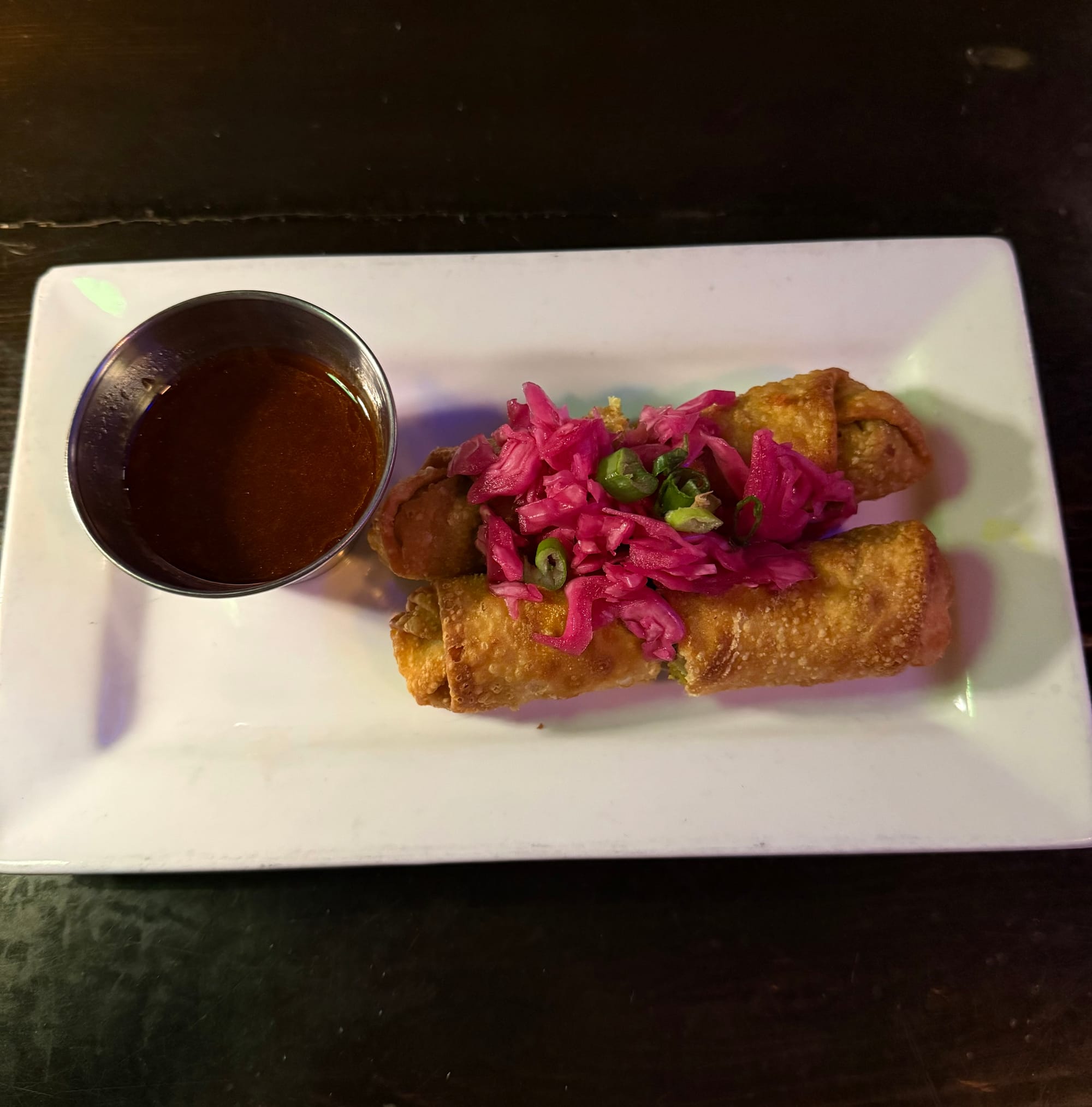 There's nothing quite like some explosive Asian flavors and enticing cocktails after a day on the slopes. This specific day happened to be New Year's Eve, the last night of my Colorado-Wyoming week. After watching Snow King's torchlight parade (I'd love to take part in one of these one day) and fireworks, we crunched our way across the snow-covered street to the restaurant. There's a lively bar area up front illuminated by pink neon, and a table section in the back, with something of a library theme: volumes of old books occupy multiple cubbies along the wall above wooden seating booths. Nice and cozy on a cold winter night.