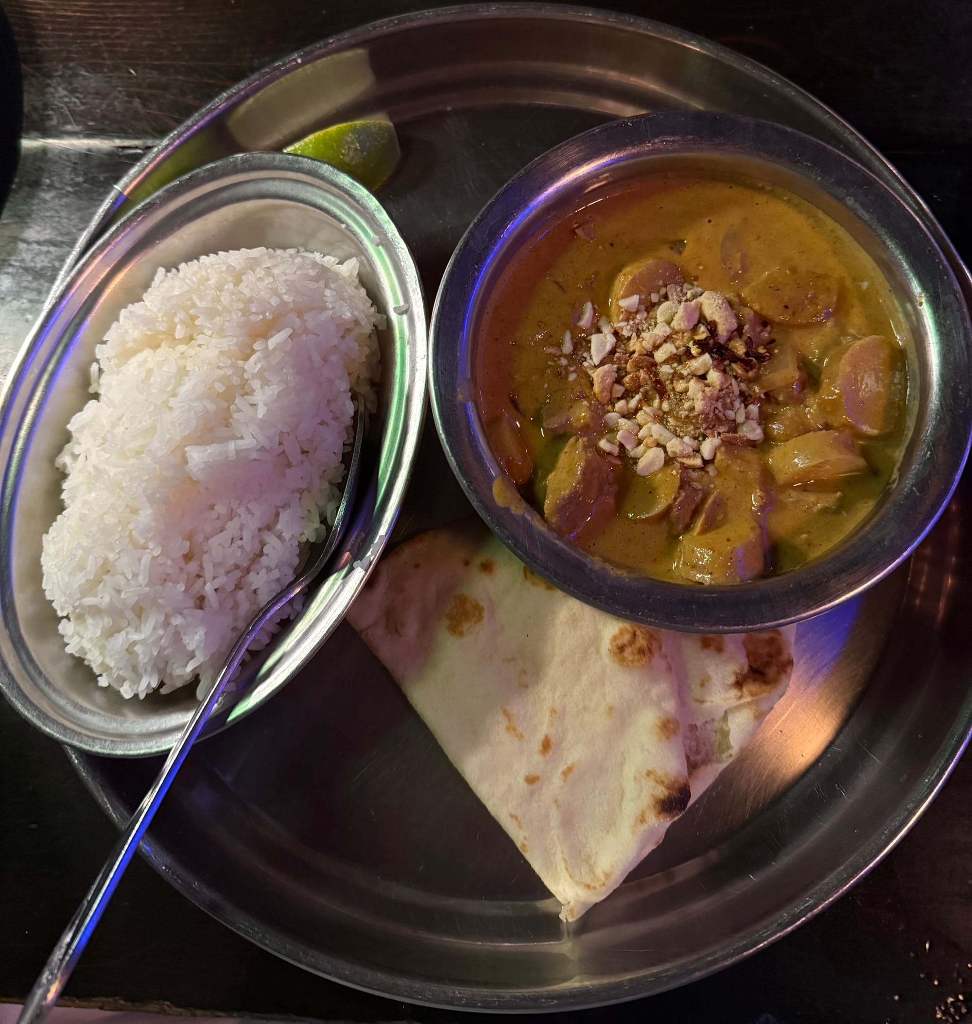 You'll find dishes from all over Asia here, even if the menu is described as Indian-Thai inspired. I would typically lean towards the former, but since we had just eaten at a restaurant specializing in the subcontinent's delightful cuisine a couple of nights prior, I opted for more Siamese-fusion fare with a Wyoming twist: Bison Massaman Curry. Utilizing meat from the large bovine instead of the traditional chicken, this stew also included fingerling potatoes, shallots, yellow onions, coconut cream, peanuts, and was served with jasmine rice and naan bread. Massaman curry (which CNN Travel has ranked as literally the number one food in the world on multiple occasions) features influences from Persia and India, along with the typical Thai ingredients you'd expect in a kaeng. Usually relatively mild in capsaicin (though here you can select your heat level; I went with a 3/5), but rich, savory, and a bit sweet, this is perhaps "the king of curries". Spices like cinnamon, cumin, cloves, and others combine to deliver a deliciously complex base, and the bison was a neat choice that held up well to those bold flavors. And the rice and soft, buttery naan were a great way to soak it all up.