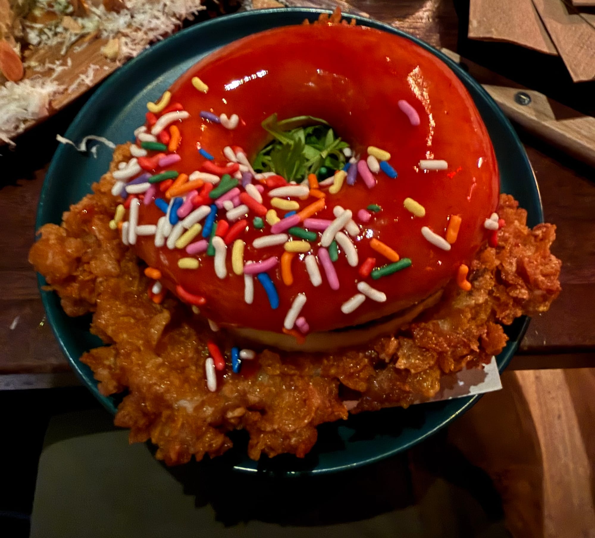I promised I'd get to the food, and I never disappoint. There are some sharable snacks including spicy koji cucumbers (not something I'd usually eat, but quite good!) and a baby gem lettuce salad with green goddess dressing, toasted almonds, and a shower of parmesan. But what really matters are the chicken sandwiches, made Taiwanese-style (coated with sweet potato starch and five-spice powder mix) in four different varieties. The Hot Honey with buttermilk and thai basil on a potato bun, and the Salted Egg Yolk with dried shrimp and pickles on brioche were good, but I had to go for the Mochi Donut. There was no bun for this certifiably insane sandwich: instead, a strawberry glazed (and sprinkled!) sliced donut served as the housing for the chicken... after the mandatory photo for The Gram, it was recommended to flip over the top donut to avoid getting red icing all over your fingers. To complete the dish were habanero, cilantro, and a slice of pickled pineapple. This sandwich absolutely blew my mind, hitting every single taste bud in my mouth with sweet, salty, spicy, sour, soft, squishy, crunchy... everything! I've never done crack – shocking, I know, considering the frenetic way I write and talk – but I imagine this must be what it's like. (That sound you just heard was my parents letting out a massive sigh of relief.)