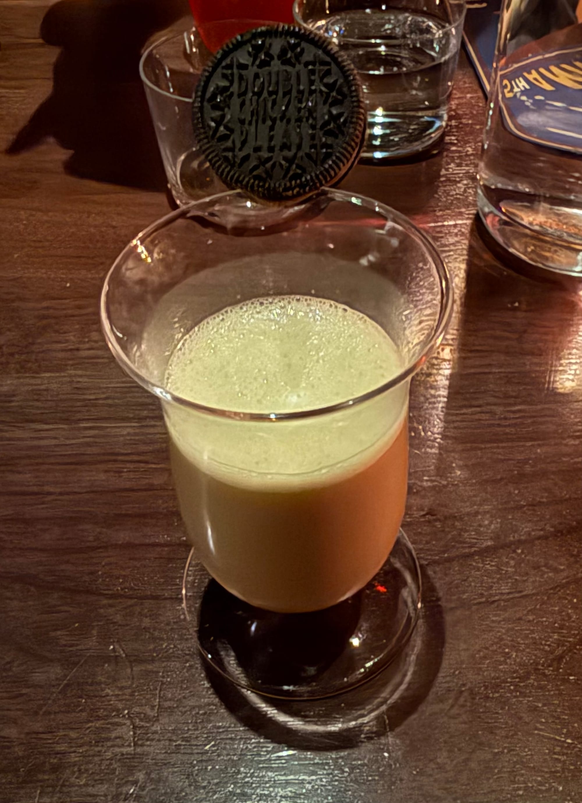 For dessert was French Toast, consisting of Grey Goose vodka (again!), roasted barley brioche, coconut, milk, maple syrup, and egg, and finished with a house-made espresso Oreo emblazoned with the DCP logo. You can already guess what this tasted of: my favorite breakfast food, that scrumptious custardy eggy bread with notes of cinnamon and vanilla, cut by the chocolaty acerbic bites of the cookie. I can't claim to know how they accomplish this culinary/mixological sorcery, but someone deserves a Nobel Prize, or at the very least a James Beard Award.