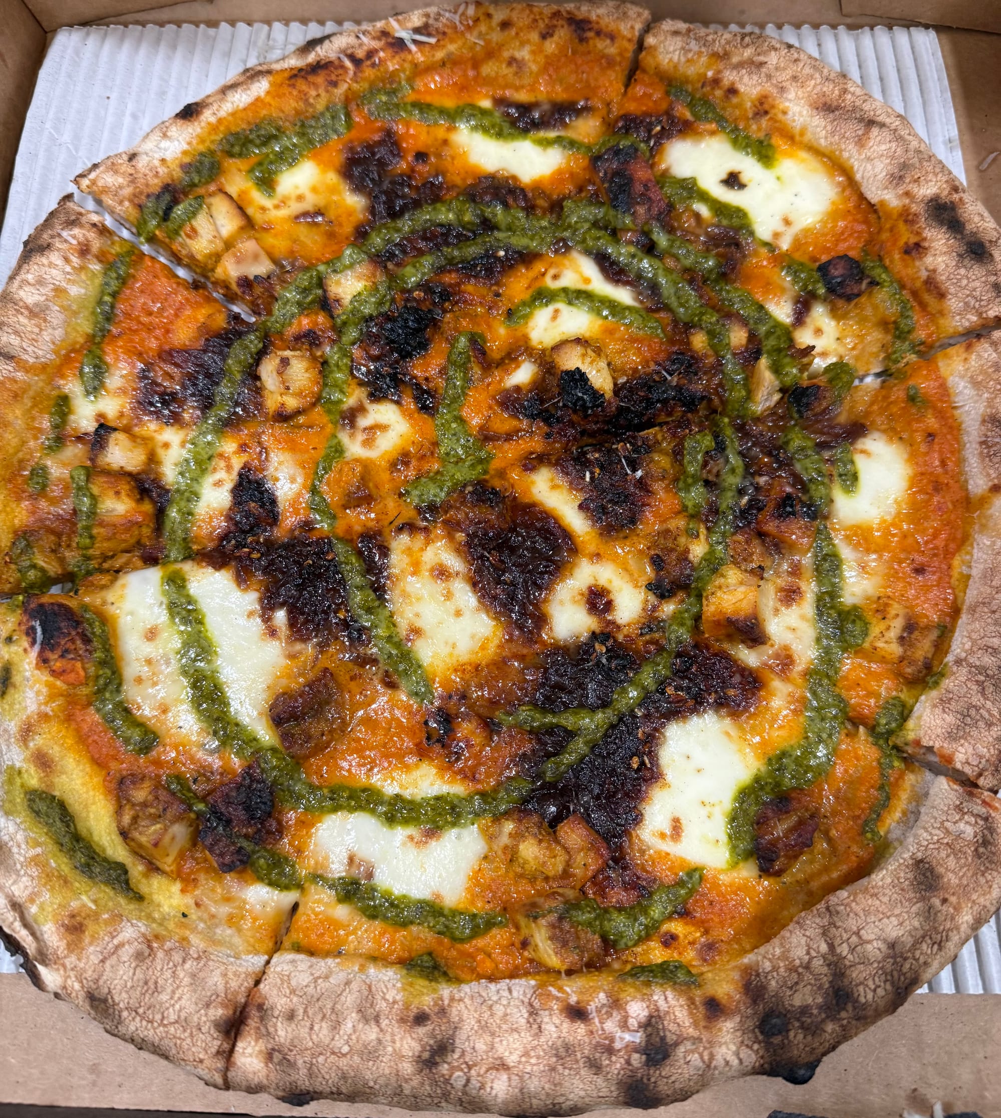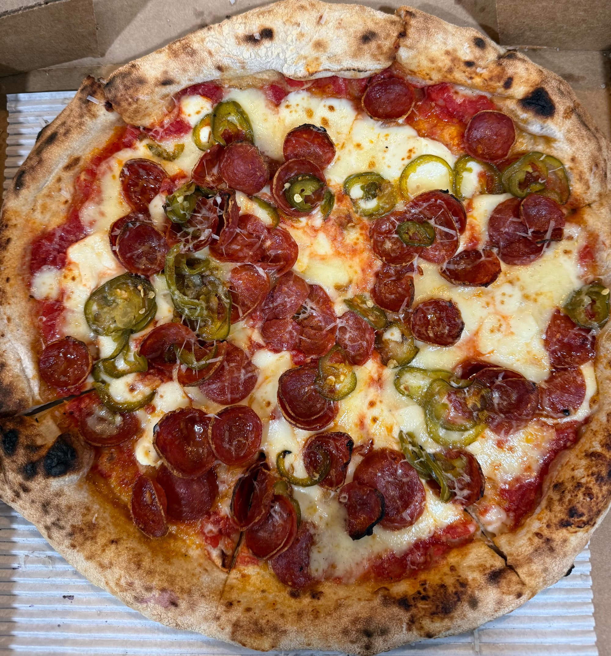Pepperoni: smoked tomato, mozzarella, parmesan, white cheddar, ricotta, cup & char pepperoni (you can sub halal pepperoni if you are still a big Free Palestine guy). Even a seemingly simple standard gets reimagined here, with two types of the spiced salami and four (4) cheeses that work together for melty, sumptuous goodness. Of course there is also the opportunity to customize, so add on some pickled jalapeños, expertly sliced paper-thin to prevent the overly vinegary taste that so often plagues this pepper. This is as close to "normal" as you're going to get here, but it still has their signature flair, and of course first-rate quality.