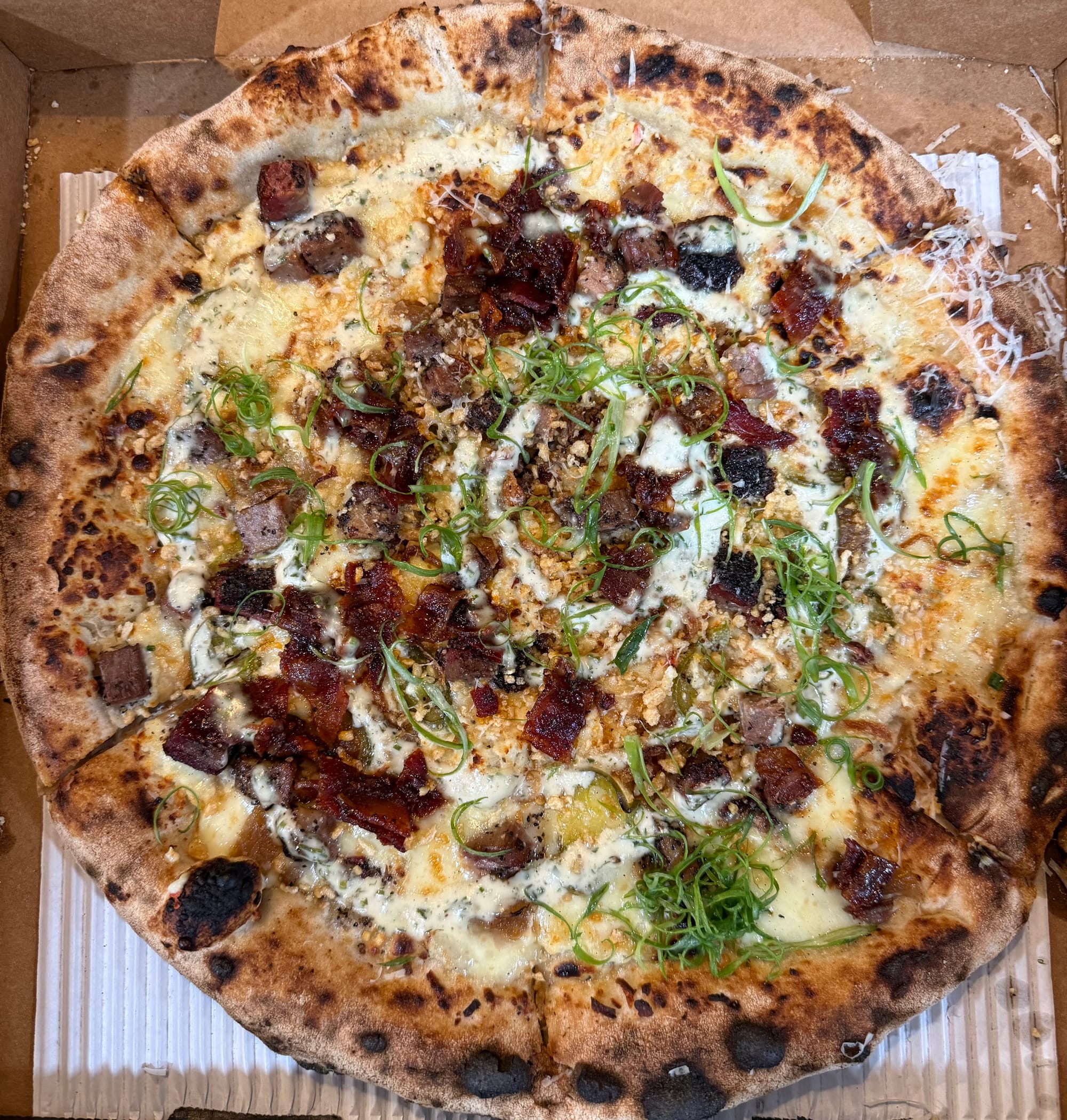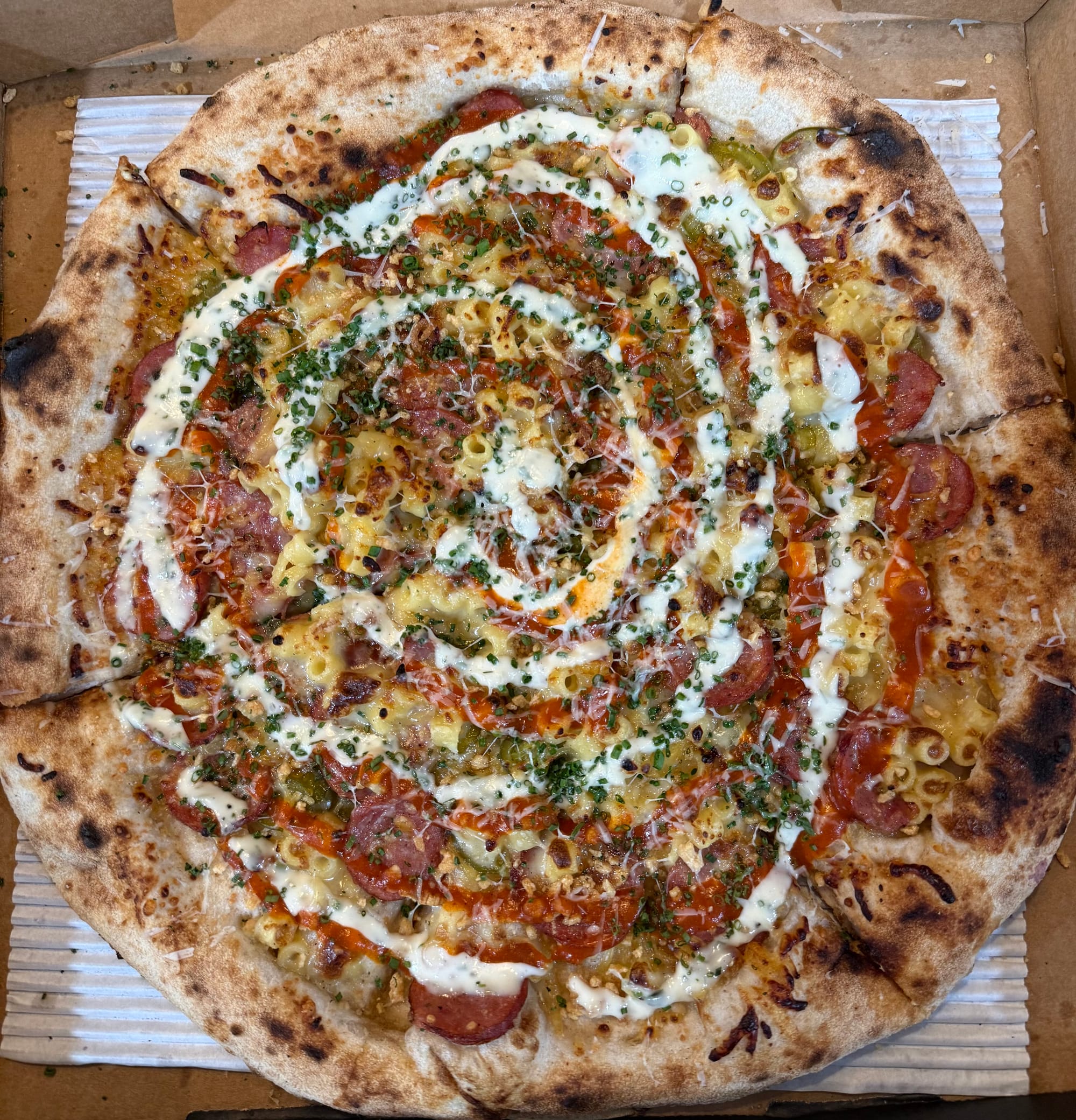Mac Attack: smoked gouda and beer mac & cheese, Texas Akashi beef jalapeño sausage, pickled jalapeños, garlic breadcrumbs, parmesan, and chives (you better believe that I chose to "dirty it up" with a swirl of buffalo and ranch). A truly spectacular pizza: substituting the normal mozzarella for everyone's favorite cheesy pasta was a brilliant move (like Cici's on crack), and the spicy sausage was extraordinary. I appreciated the effort to disguise things by throwing a little bit of green on there via the chives, but this certainly wasn't the healthiest thing I've ever consumed. It's fine though... soon there will be Ozempic in the water supply like fluoride (no offense to my Portland readers) and we'll be able to eat whatever we want all the time. I still dream about this pizza at night, and I pray that they bring it back for a second run one day. Freaking incredible.
