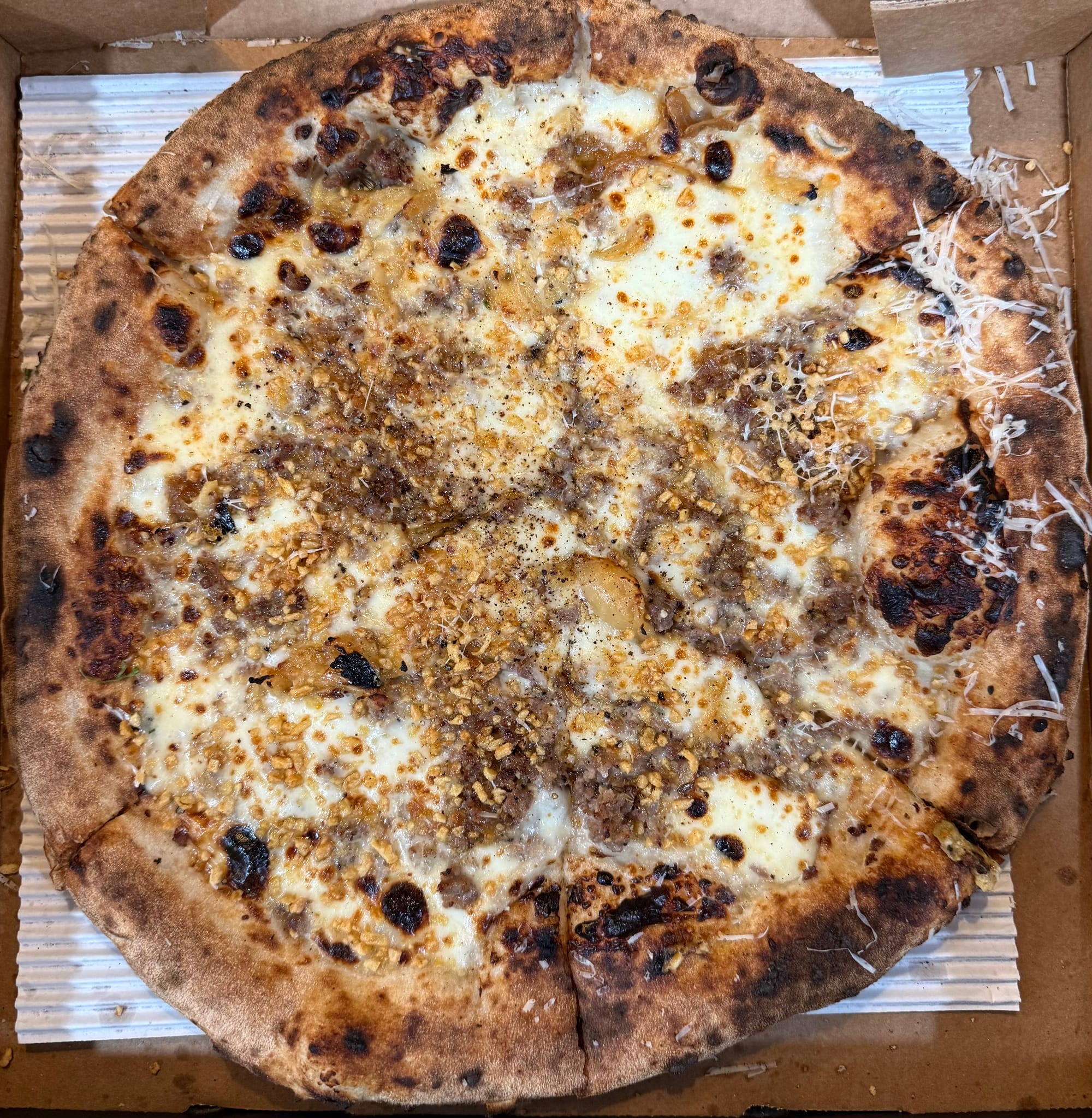 Caccio de Peppe: smoked onion bianco sauce, fresh mozzarella, parmesan (side note: if you aren't pronouncing this as "par-MEE-zee-en" in your head when you read it, you aren't watching enough Rick & Morty), roasted & crispy garlic, and black pepper. That's the base model, but clearly adding fennel-pork sausage and caramelized onion is a must. Only the second one on the list here, but we're already getting crazy. Indulgently creamy and rich like the classic pasta from which it takes its inspiration, this is not a 14-incher that you can just house in one sitting unless you are among the most gifted of individuals (I probably would have back in my prime, but this time I had leftovers for days). The sausage is a great way to cut through all that dairy, and the criminally underrated fennel provided a nice sweetness and touch of aromatics.