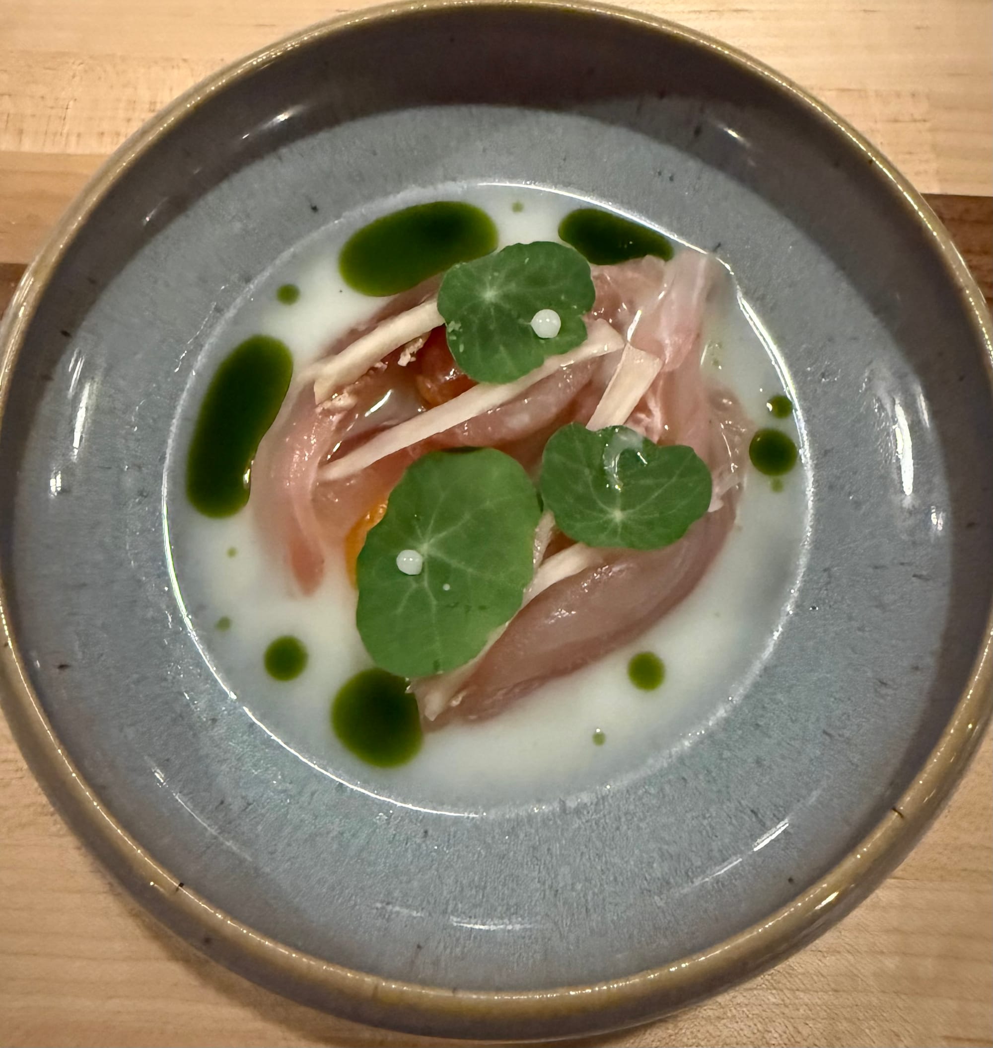 As for the food, we opted for the tasting menu, which consists of six main courses (that apparently changes frequently: one review I read beforehand described an almost entirely different meal than the one we got) plus a few other small bites. To begin, an amuse-bouche consisting of two pieces: Atlantic salmon wrapped in a speckled trout leaf and topped with Kaluga caviar, and an amaretto-marinated pear with crème fraîche and molasses syrup. This savory and sweet combo set the tone for what was to come, that it was to be a tweezer-forward, Michelin-aspiring dinner.