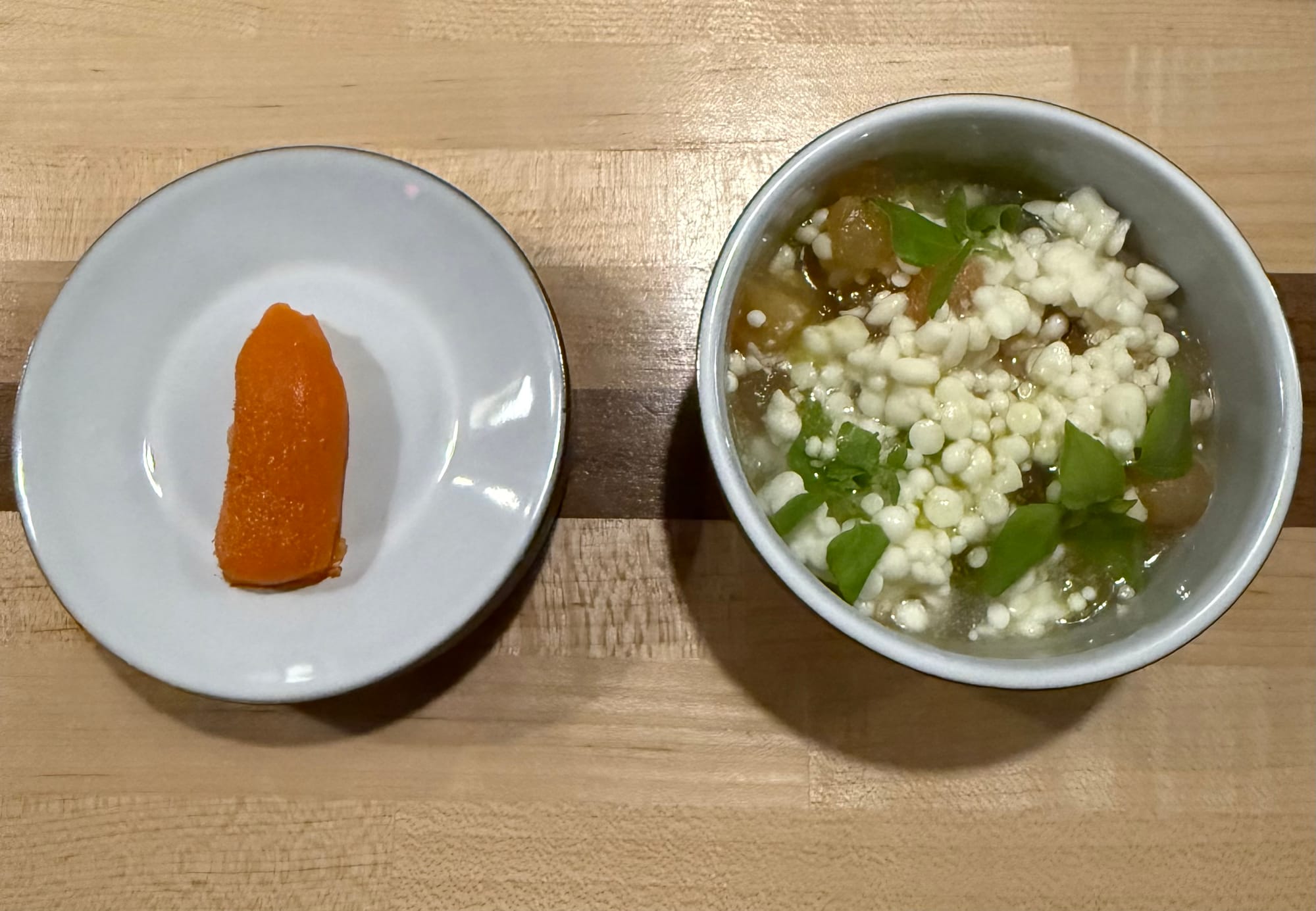 Things went downhill slightly for the next course, Bairdi Snow Crab, which was overwhelmingly the least popular at our table. There were two preparations here: a hunk of claw meat coated in spiced ghee, and a small bowl of crab in a tomato consommé with crème fraîche pearls, golden melon, and serrano oil. While I did enjoy the rich buttery flavor of the first bite, the mucilaginousness (now that's a word, though possibly not a real one) of the tomato gelée didn't entirely work for me. I'm not sure we needed another cold dish either.