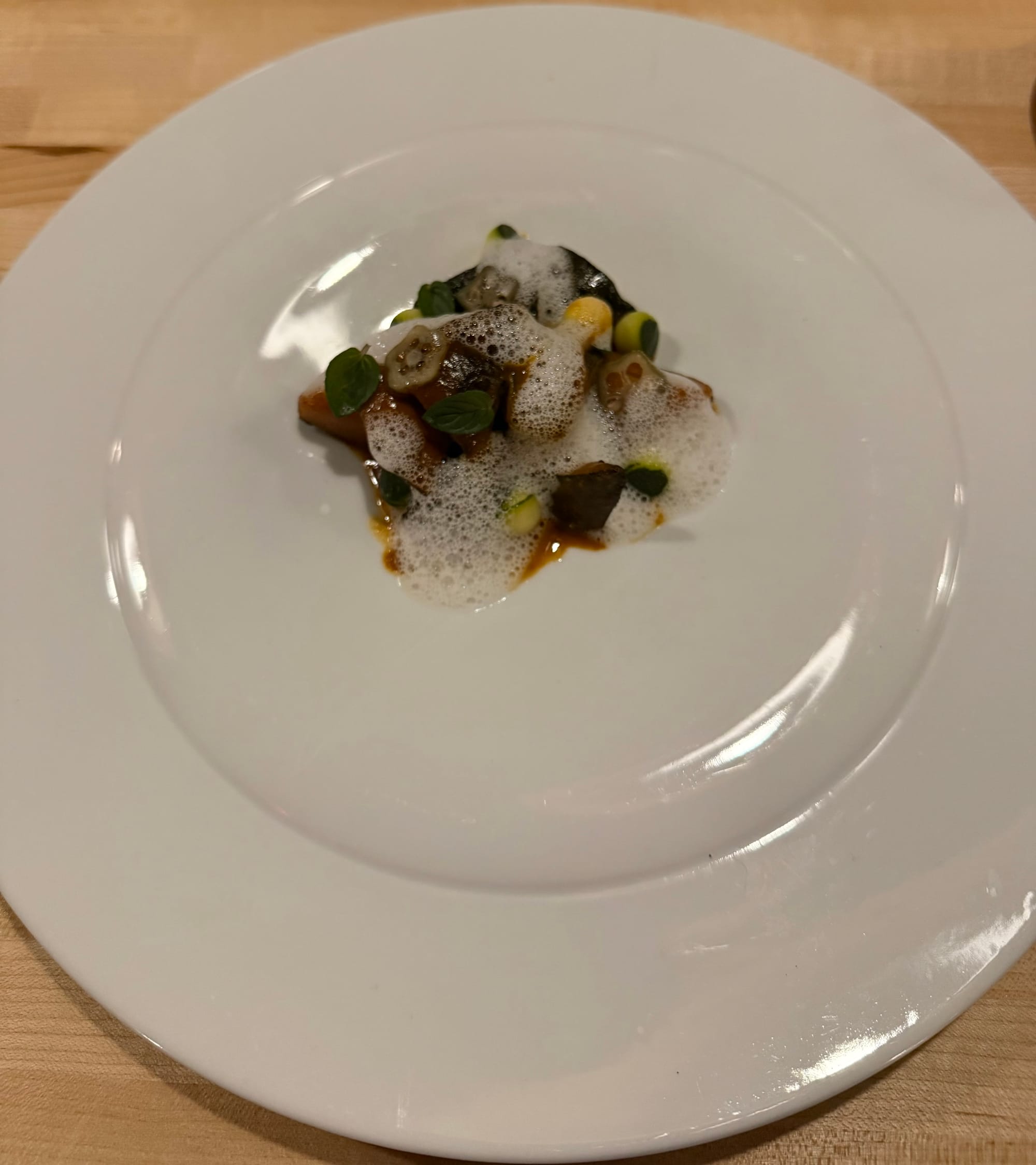 Another item that could have been improved was the Thai-influenced Panang Curry. In lieu of a protein, the star was calabacita squash, with spring peas, coconut lime foam, pickled okra, and chocolate mint atop a thick, complex red sauce. While the curry had some lovely rich flavors, mild heat with subtle nuttiness and sweetness, for me the squash was somewhat mushy and simply the wrong choice to carry the kaeng. While it would have been less innovative, a traditional beef or chicken (or duck or even crab) could have made this much better. I suppose the chef wanted a vegetable course at the midpoint of the progression, but he isn't winning any points from Adrian Reviews that way.