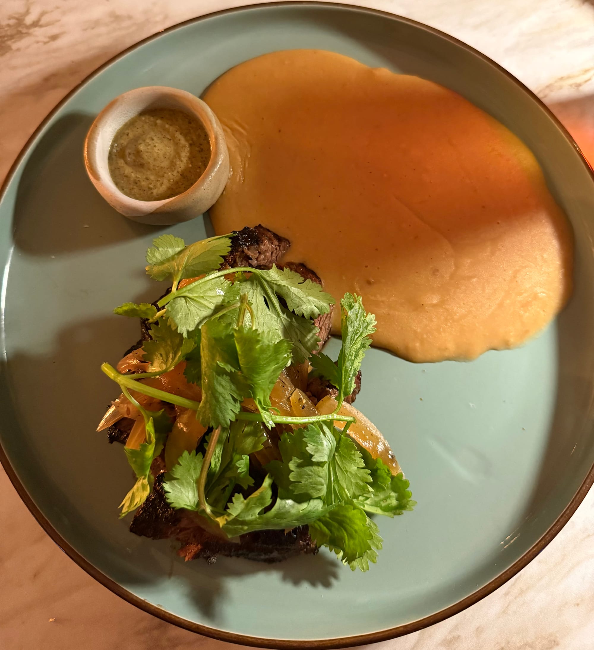On to the mains now, where I couldn't not order the Texas Wagyu Carne Asada. This 6 ounce bavette steak was gloriously seasoned and grilled, topped with caramelized onions and served alongside frijoles aligot (a sumptuous bean/cheese mixture), a spicy green salsa, and otherworldly 50/50 tortillas – half corn, half flour. I'm not exaggerating when I say these were the best tortillas I've ever had, and you can bet that I've tried A LOT of them. Perhaps a bit less creative than some of the other options on the menu, but the execution was perfect. A well-constructed taco with all of the various components was beyond delicious... I will absolutely order this again next time.