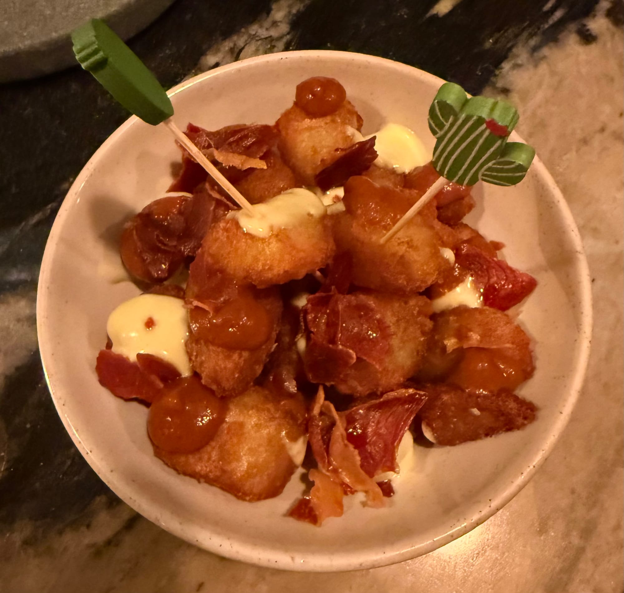 To start, a couple of anojitos. Papas Bravas, a take on the classic Spanish tapa (can tapas be singular?), featured fried potatoes, epazote (a pungent herb also known as Mexican tea) aioli, chintextle XO (a Mexican chili paste) in place of the usual salsa brava, and prosciutto. The starchy cubes were hot and crispy, and the dual sauces had a smoky/peppery interplay that I quite enjoyed. Additionally, the inclusion of the cured ham added some nice saltiness, and some cute cactus-topped toothpicks were a delightfully fun way to eat this dish.