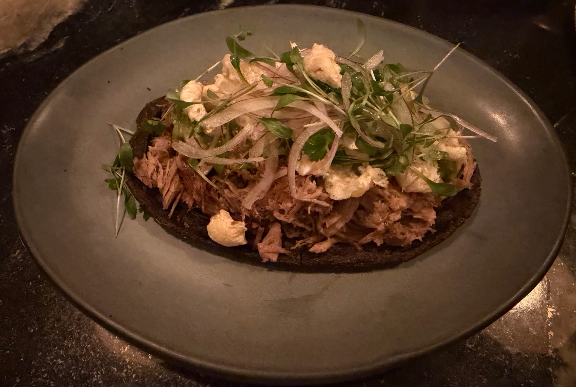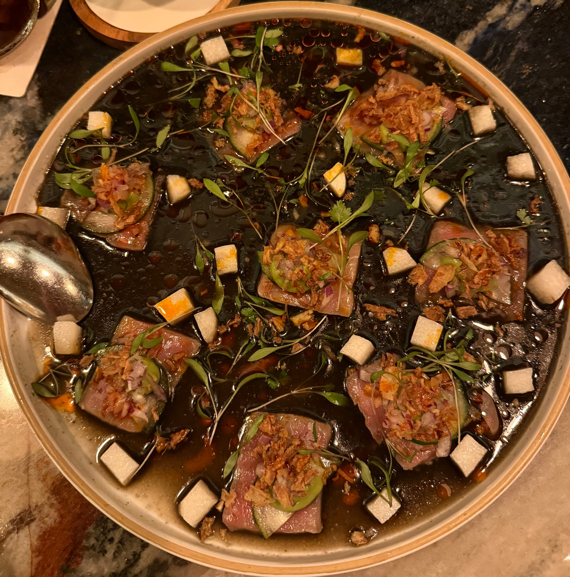 Moving onto the crudo section of the menu, we opted for a Tuna Tiradito. This Peruvian import is similar to ceviche, the difference being that the fish is sliced very thinly instead of cubed, and the sauce is poured over immediately before serving, so it remains raw, sashimi-style, instead of being cooked by the marinade. Chef Adrián's interpretation consisted of an aguachile negro with squid ink, avocado, cucumber, jicama, crispy shallots, and chile oil, served on a "big dramatic plate", as our very excellent waiter put it. Gloriously acidic but balanced with some salinity, the fish really shined here, and the jicama and shallots provided a pleasing textural contrast to the soft tuna.