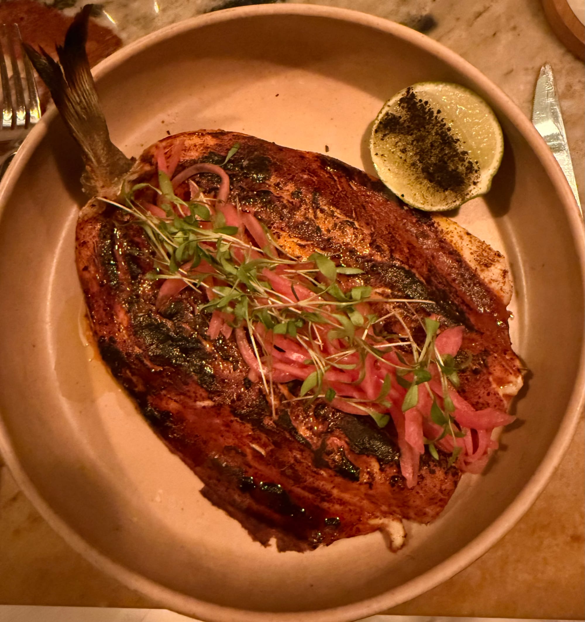 It's been a banner year of trying new dishes that I learned about while watching Beat Bobby Flay (such as maafe at ChòpnBlọk and fesenjoon at Rumi's Kitchen), and that continued here with my entree (or fuerte), Branzino Tikin Xic. This Yucatan delicacy consists of fish marinated in achiote paste, wrapped in a banana leaf and roasted (traditionally over hot coals). Here the European seabass was deboned and served with the attached tail – tikin xic literally translates to "dry fin" in Mayan – and topped with pickled red onions, cilantro, salsa cruda, and blue corn tortillas to assemble your own tacos. The bright red achiote marinade gave the branzino a lovely earthy, spiced but not spicy flavor, and the perfectly cooked fish was easily portioned and distributed into the tortillas. Our waiter had previously talked me out of ordering the Wagyu Carne Asada ("you can get steak anywhere", he insisted), yet I couldn't help but ask for some of the sourdough tortillas that accompanied it... and as you might expect I preferred those. Flour > corn, always (sorry, I'm a gringo).