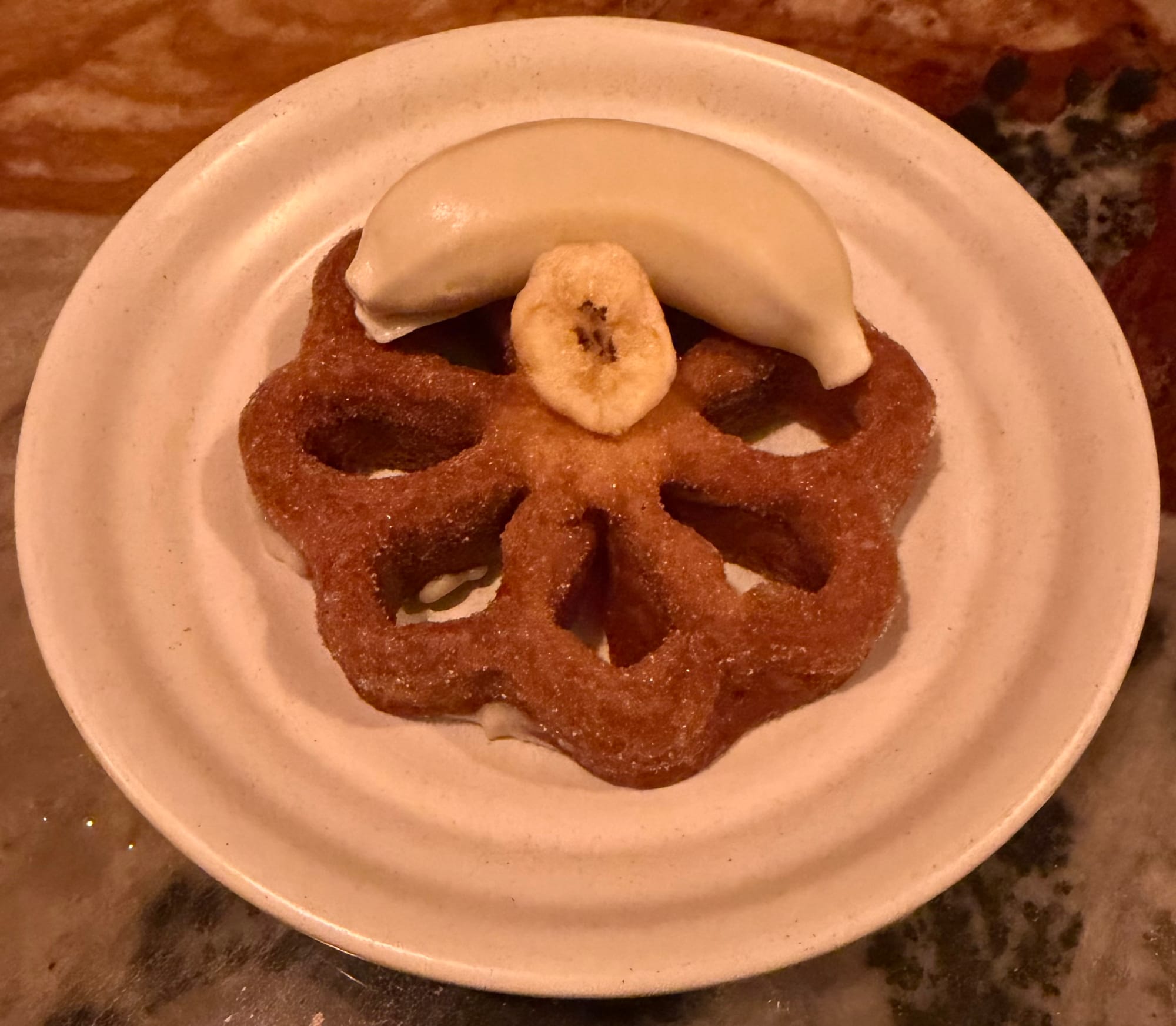 For postre, I had to order the Banana Pudding Buñuelo. This fried, flower-shaped dough fritter was filled with vanilla custard, dusted with cinnamon sugar, and topped with a house-made banana ice cream in adorable elongated shape mimicking my second favorite fruit, complete with bananus. Reminiscent of a crispy funnel cake, the buñuelo was delicious, and though the ice cream was a bit overly firm (probably to keep its shape in the mold, worth it for the lolz), I loved the abundant banana flavor.