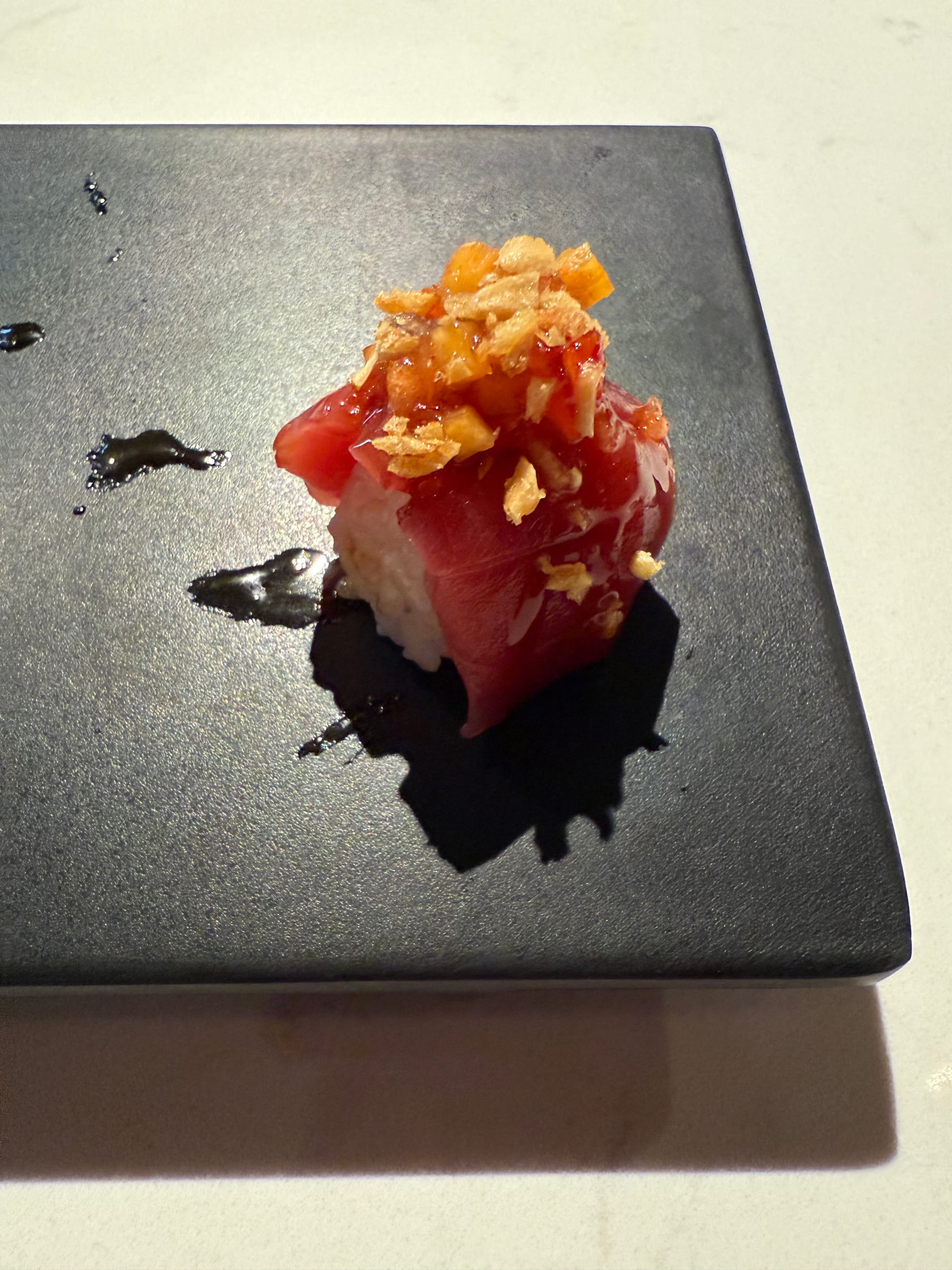 Tins (also known as This Is Not Sushi) actually opened almost two years ago. Very unassuming from the outside, you'd never know that this Heights strip mall eatery near I-10 and Durham houses one of the best omakase experiences in the city if you were passing by. Chef Sky (originally from Malaysia by way of New York) is the mastermind behind the operation, and he was incredible on my Saturday night visit. Apparently his sous chef/assistant just left immediately before service, so he was literally doing everything by himself, from preparing the fish to plating and serving: this was a LeBron in the 2016 Finals-esque performance, a one-man show for the ages.