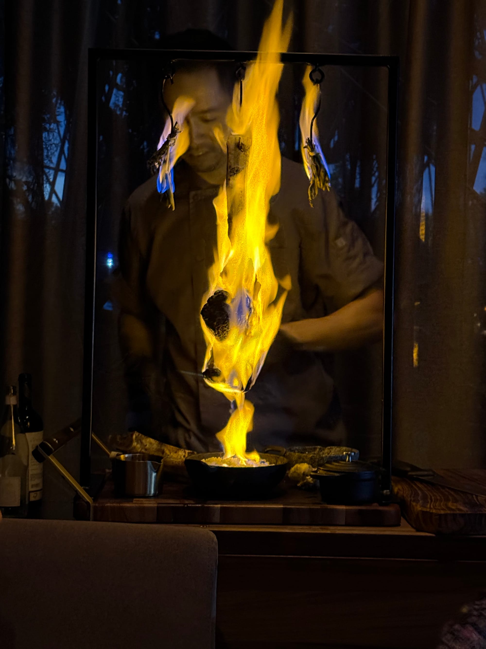 Finally, we come to the flaming Wagyu tomahawk. This signature item is prepared table side, carted in with the rib bone hanging down alongside some sage and thyme. The chef then flambés the meat (in this case with bourbon, but I believe normally with mezcal) in a lovely bit of pomp and circumstance, and then carves it up and serves it on a large wooden block. The result is a perfectly pink medium rare with a delectable smoky char on the outside. They also serve up the fatty spinalis (or rib cap, aka the Rolls Royce cut), which has such intense marbling and an almost burnt ends-like crust on the outside. And I can't forget the tremendous sauce, which was a chimichurri with some of the bone marrow mixed in. Remarkable.