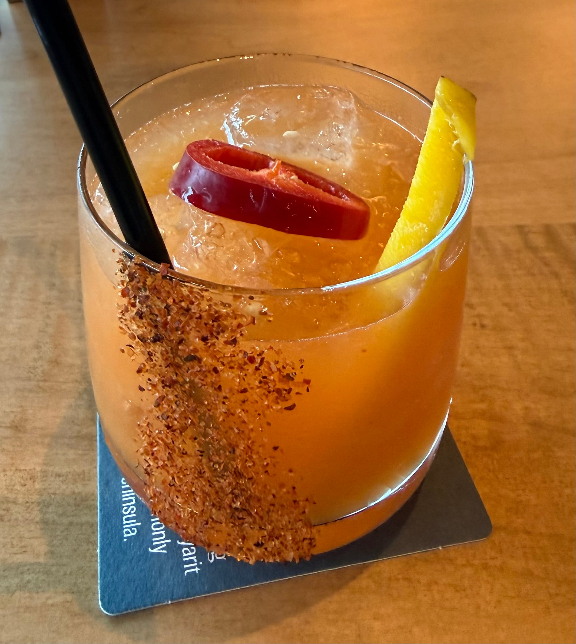 As with any Hugo joint, margaritas are front and center on the drink list. That includes the lavish "Greatest Margarita Ever Sold", priced at an eye-popping $34 and also seen at some of the other locations mentioned above. But the rest of the cocktails are pretty reasonably priced, and I really relished the "Conejo Malo" with chile de arbol-infused Amaras mezcal, lime, pasilla-morita-ancho-infused orange liqueur, mango-carrot juice, chiles toreados syrup, and a carrot-Tajin rim. Vibrant and refreshing, the bright orange beverage was delightfully spicy, but wonderfully balanced by the sweetness of the fruit-veg juice. I'm developing an affinity for carrot cocktails of late, but regrettably the power of my contact lens prescription has yet to improve.