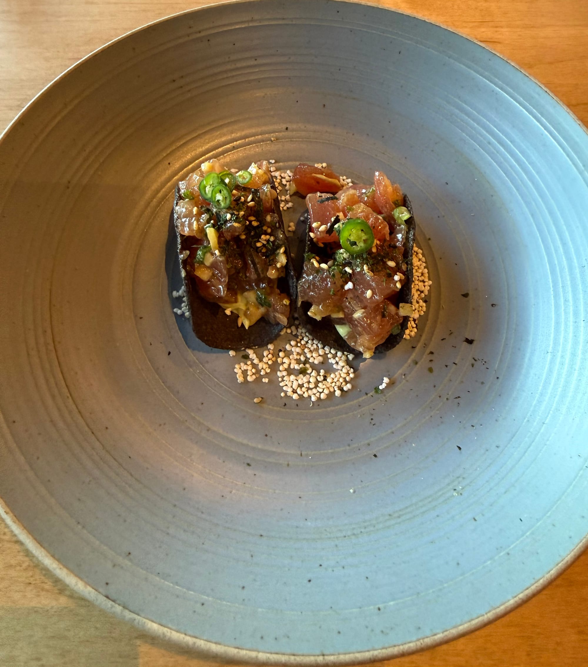 To begin, from the "Crudos" came the Taquitos De Atún, a tuna crudo with soy, sesame, ginger, green onion, chile piquín, and furikake. I don't need to reiterate my affinity for tuna tostadas, though this was a slightly different vehicle for the raw fish: small blue-corn tortillas were fried into mini crunchy taco shells, making for an easy bite, and the Japanese seaweed powder added a nice pop of umami. The peppers were nuanced, which leveled the dish well, even if I would have been happy with a handful more for additional heat.
