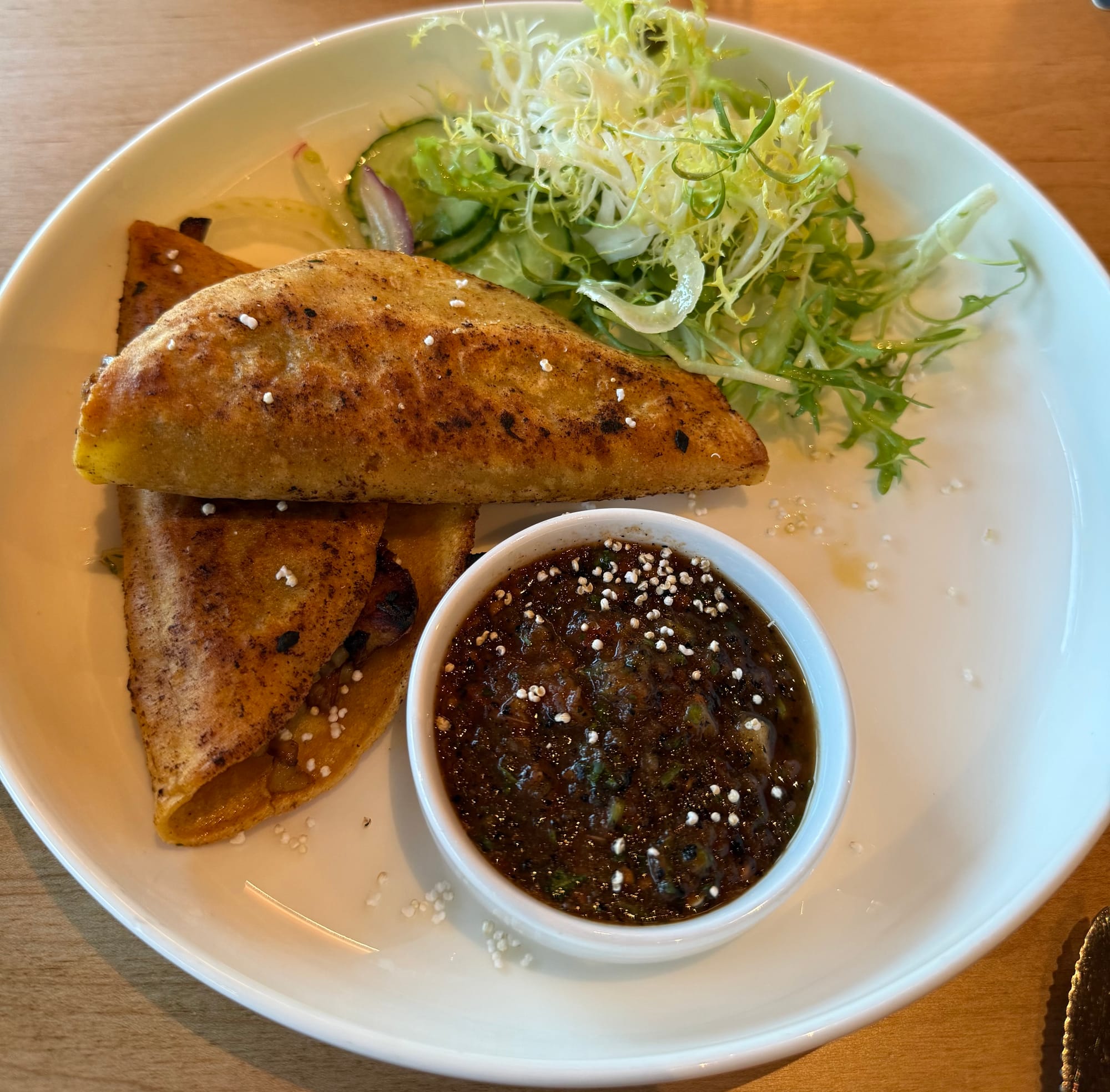 If you've made it this far and are still wondering what "Zaranda" means, congratulations, you're about to find out. The restaurant takes its name from the wire basket traditionally used to grill seafood over hot coals. Camarones Zarandeado (the adjetivo used to describe cooking via this technique, which comprise the signature entrees here) were large shrimp served with cucumber salad, housemade adobo, and a salsa trio. Also provided was a sobaquera, a massive thin flour tortilla (if you've eaten at Lupe Tortilla, you may recognize the giant unleavened flatbreads, which I now realize are actually a thing, and not just their invention) from which you can make one enormous or – more practically – multiple smaller DIY tacos. The langoustine-esque prawns were grilled to perfection, and the smoky sauce was a great complement to their inherent sweetness. Really quite delicious!