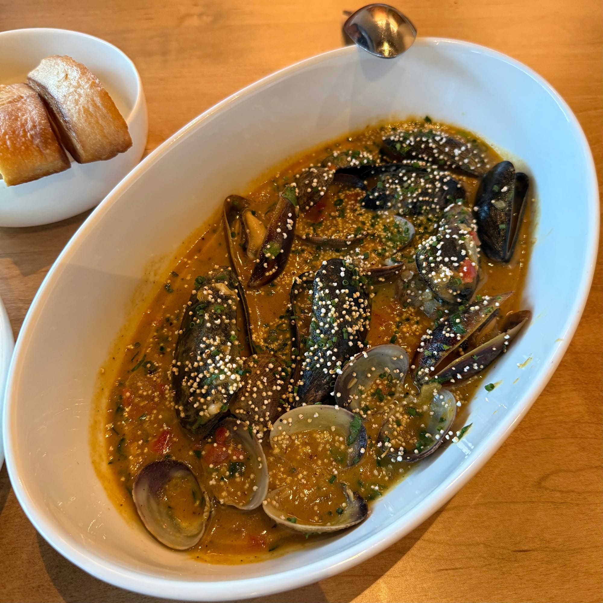 There were several oyster dishes in the "Conchas" section, but we opted for the Cazuela De Bivaldos, with mussels, clams, mole amarillo, white wine, and canario peppers. This dish, meaning "casserole of bivalves", is more akin to a stew, with a delectable yellow-orange base from the Oaxacan mole and Andean chiles. Nicely plump mollusks bathed in the sauce, which was easy to sop up with some toasted bread served on the side. It was around this time I realized that every dish so far (as well as the ones to come) contained a dusting of small white grains that I struggled to place. The waiter was able to identify them for me as amaranth, which I suppose can provide some additional starchy texture, but I suspect here were used largely for decoration. I wonder if they have an amaranth guy whose job is to just come through and shower every finished plate with the tiny seeds? Sort of a very specific Salt Bae (remember him?) tribute.