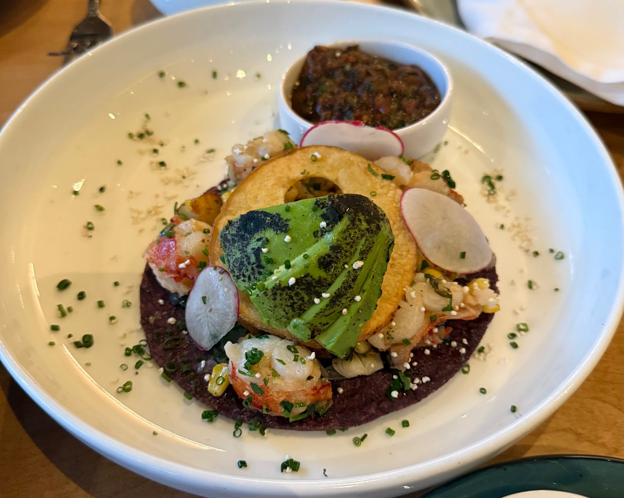 I wasn't missing the "Tostadas" zone of the menu, but instead of my usual tuna, we instead went with the Tostada De Langosta. Hunks of poached lobster sat atop the flat blue-corn base adorned with a swipe of refried beans and a disc of crispy fried potato, with bits of onion, garlic, corn, and serrano chiles, and finally garnished with some stunning charred avocado. The crustacean was decadent, buttery as can be, and the smorgasbord of other ingredients made for all manner of unique bites. More of the red salsa was available, but not really necessary in my opinion. This was a really luxurious take on the tostada, perhaps not one that will replace my beloved tuna for routine consumption, but a nice elevated change of pace.